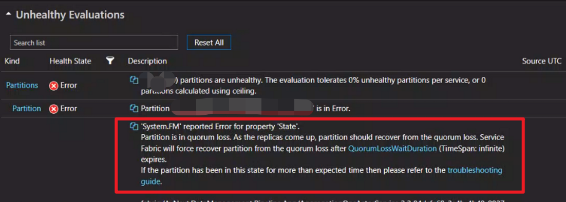 比如截图中,Service Fabric中的应用出现Error, 消息显示 Partition is quorum loss. As the replicas come up, partition should recover from the quorum loss. 应用Partition丢失,当Replicas被选中成为Primary后,Partition将从Quorum Loss的情况中恢复。但是由于SF的应用设置的QuorumLossWaitDuration 的时间戳为infinite(无限)。所以错误就无法完成自动修复。