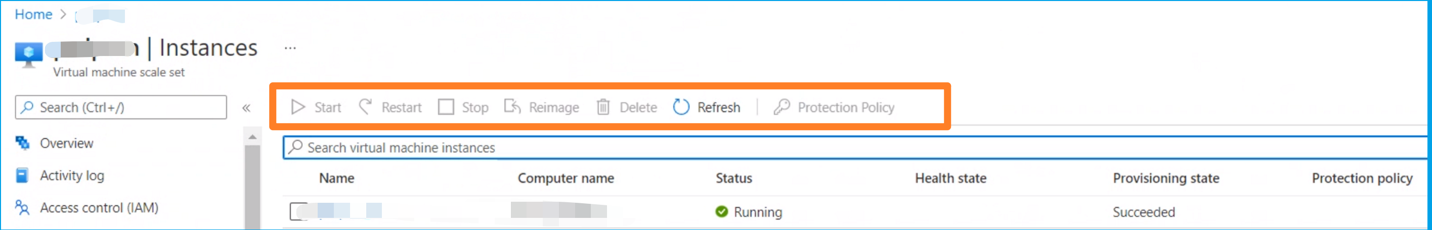 2)进入Service Fabric的VMSS门户页面,选中问题节点后,可以执行删除,重启,重置等按钮。