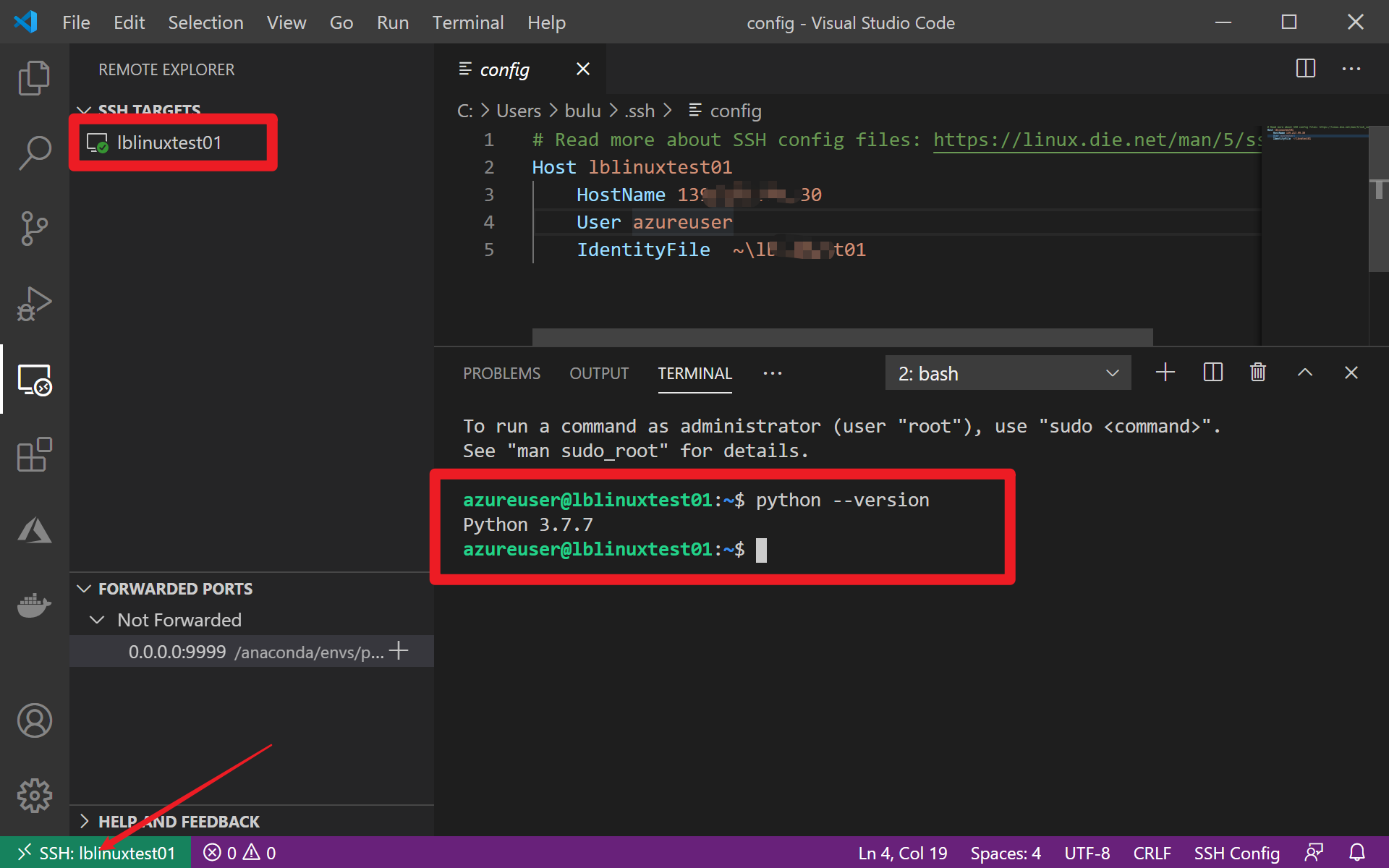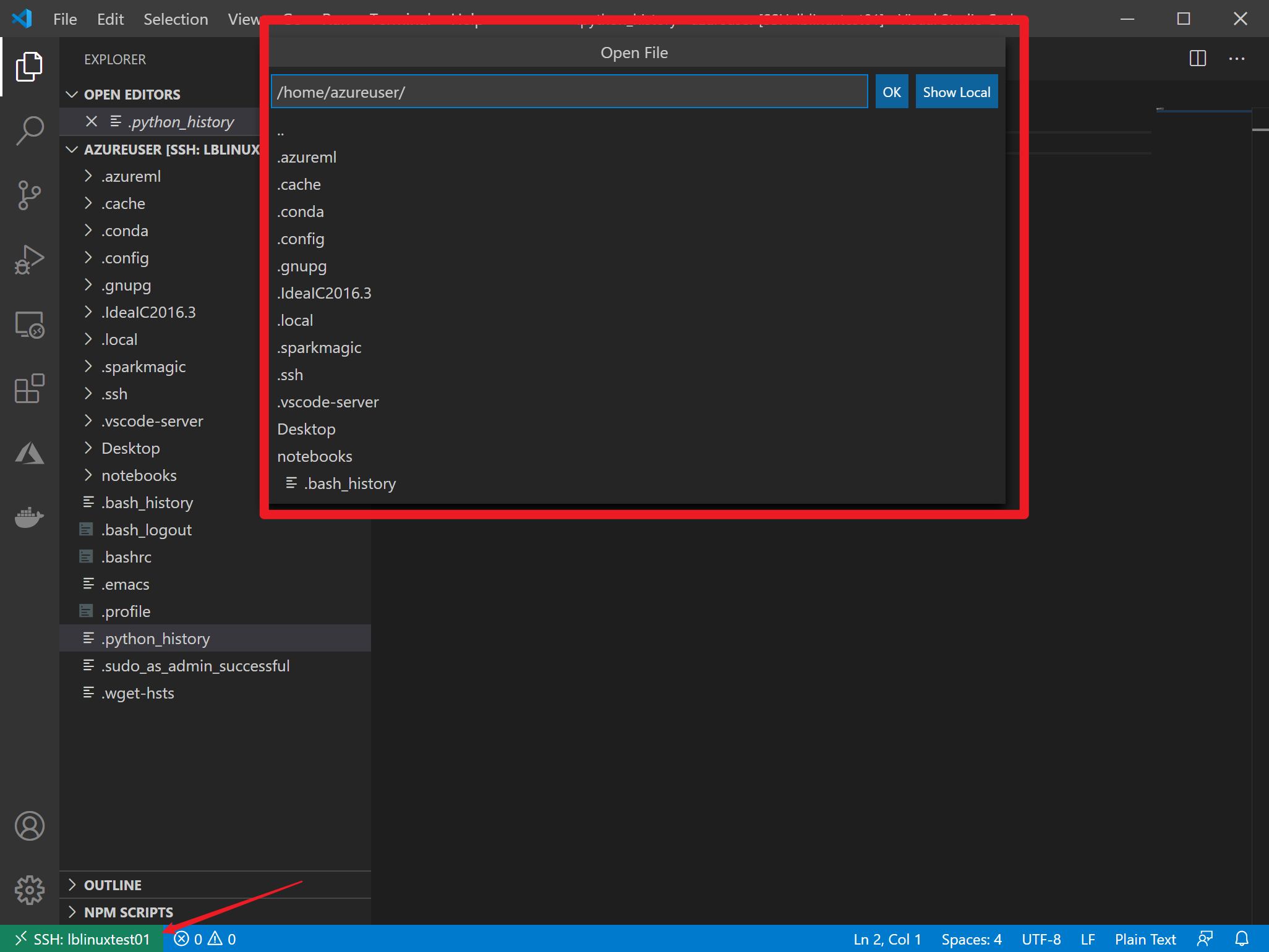 在平常的工作习惯中,如果使用VS Code做脚本的开发,是一个非常好用的工具,现在也可以通过VS Code的不同方式来连接到Linux VM中(ssh), 第一种是VS Code的Terminal中通过powershell窗口使用ssh命令登录。另外一种就是通过插件remote-ssh登录并管理Linux VM机器(非常方便的小工具,也是本文采用的方式)。 当SSH连接成功后,可以直接在VS Code中直接打开VM中的文件夹,运行脚本及编辑文件。非常方便。