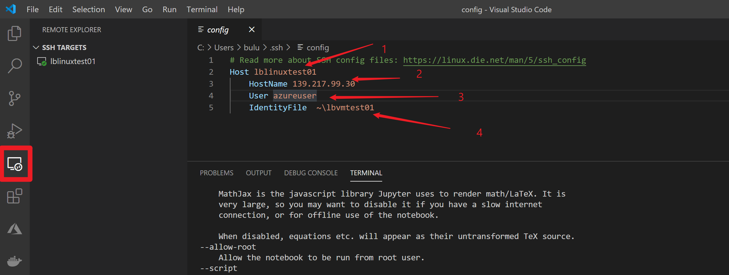 - 在VS Code中先安装Remote-SSH插件。成功后可以通过Remote-SSH图表,添加新的Host config文件,在文件中输入Host (自定义名称),Linux Host name IP 地址,username ,IdentityFile为您SSH的私钥文件路径。
