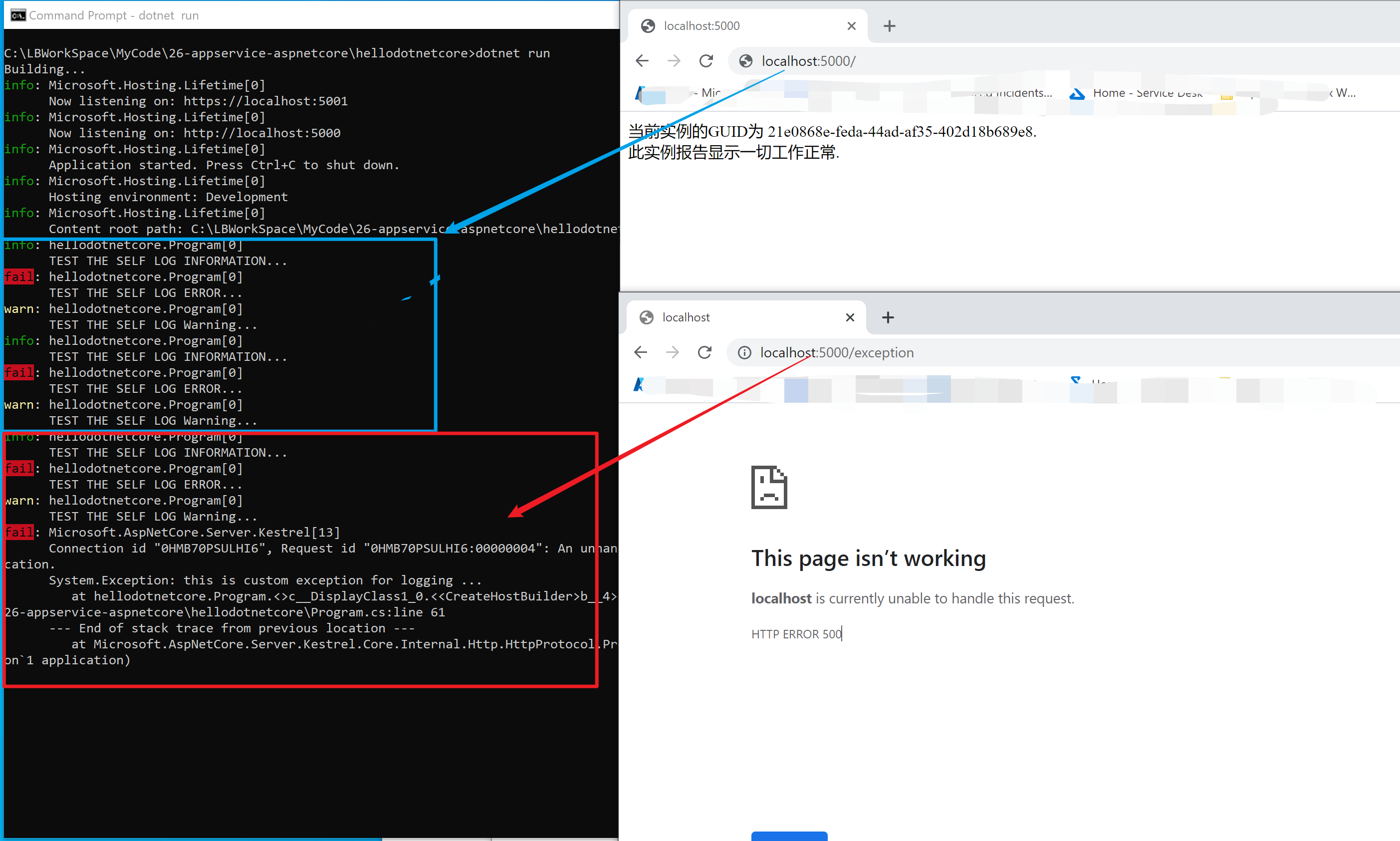 在本地通过dotnet run测试发现,访问 http://localhost:5000/ 和 http://localhost:5000/exception 就可以看见在代码中的加入的日志信息,达到期望。