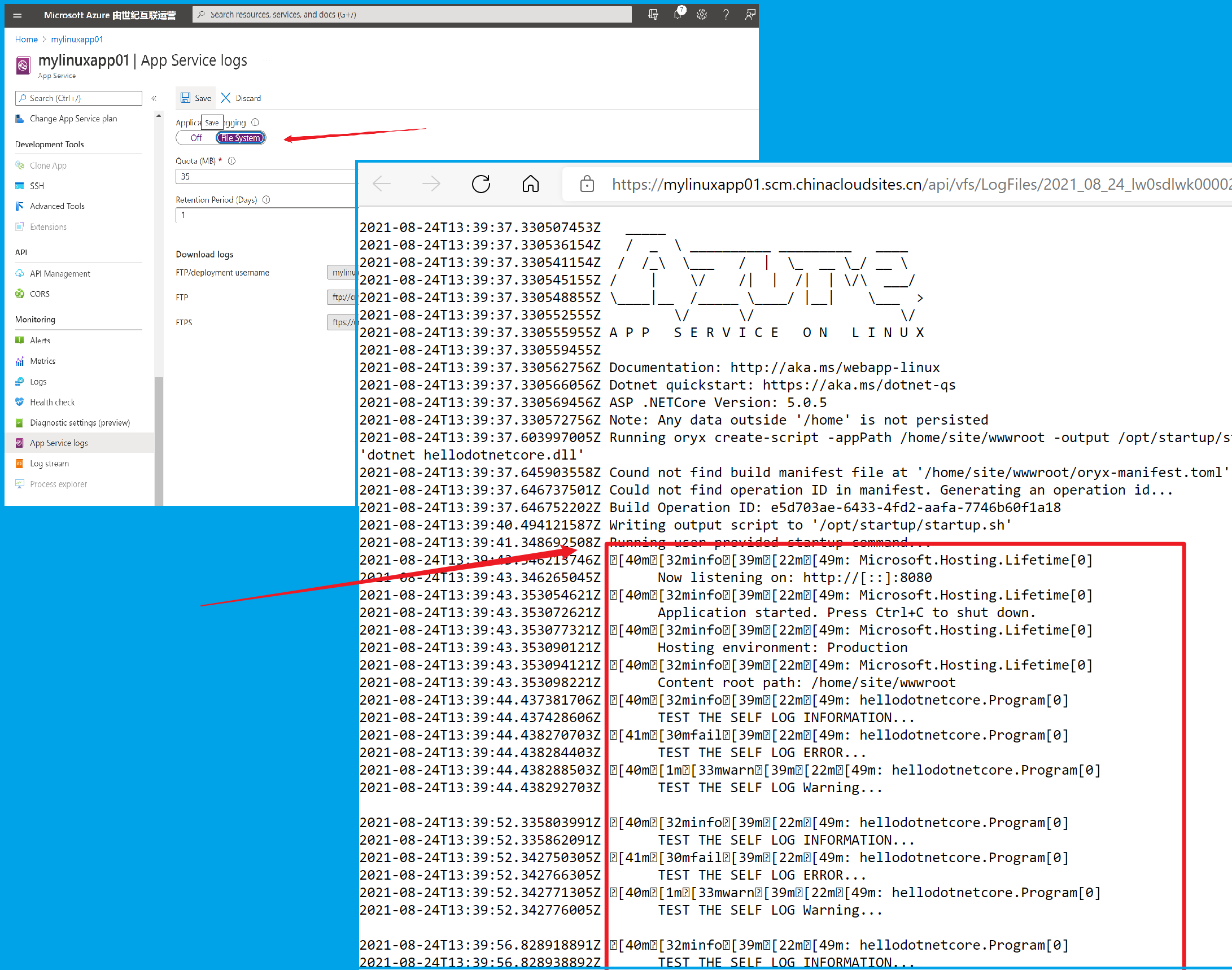 为 Azure 应用服务配置 ASP.NET 应用: https://docs.azure.cn/zh-cn/app-service/configure-language-dotnet-framework#access-diagnostic-logs