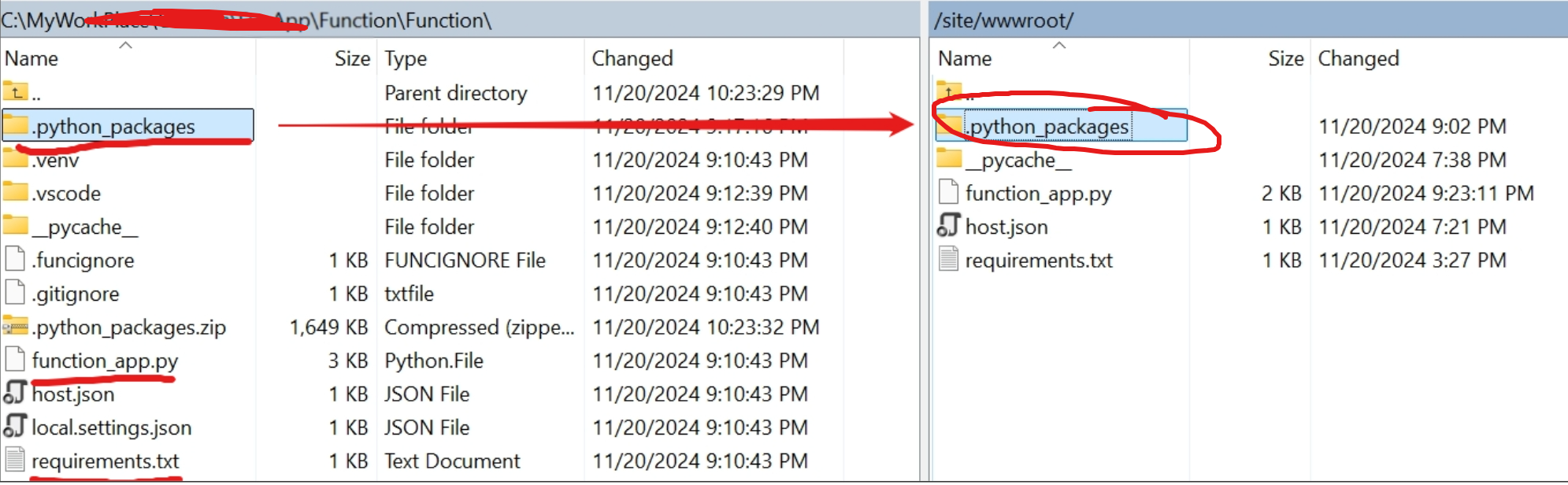 第二步:把 .python_packages 文件夹中的内容通过FTP上传 Function App的wwwroot目录中