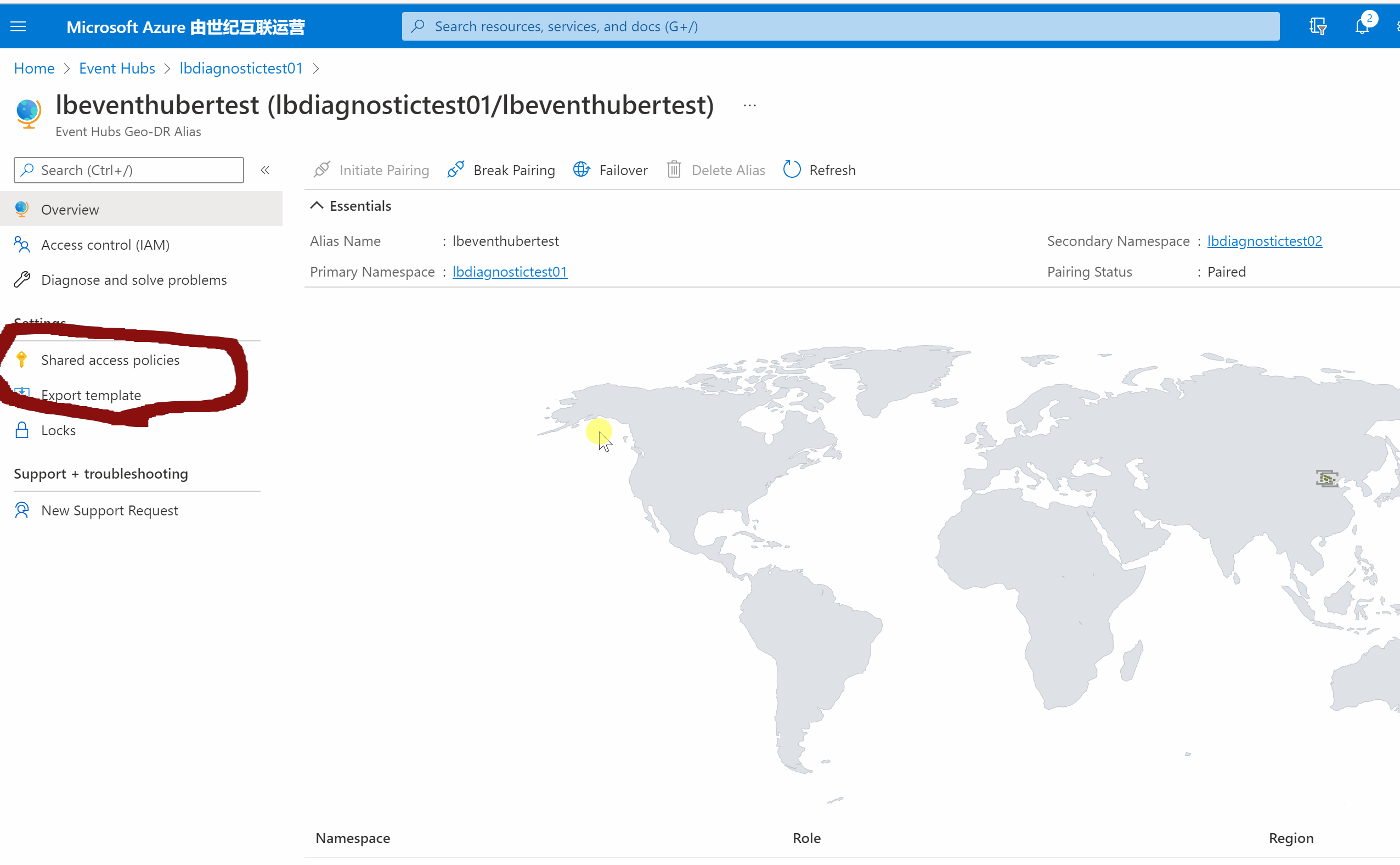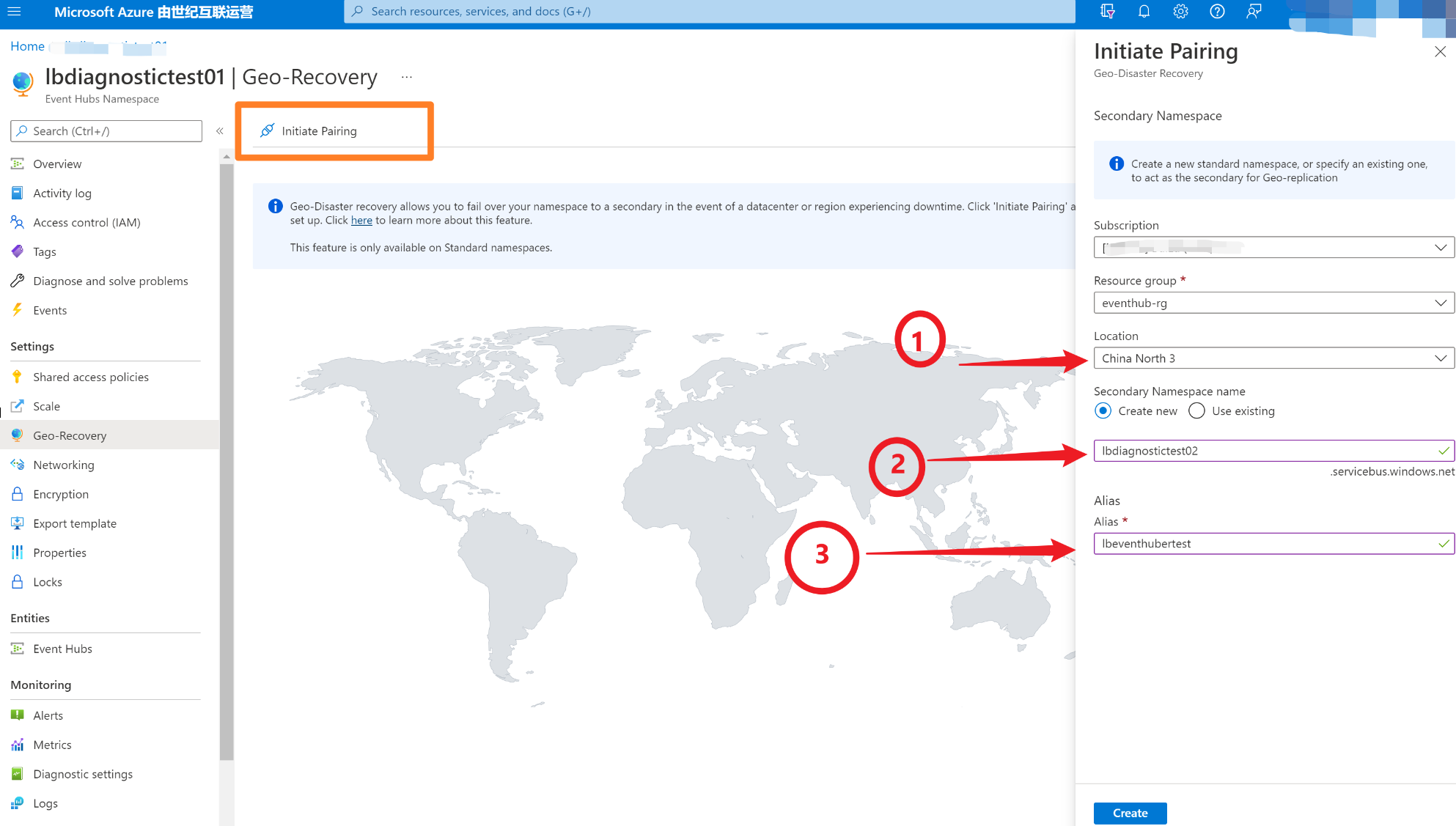 这一步的操作步骤, 执行简单,根据页面指引,一步一步完成即可。官网步骤:https://docs.azure.cn/zh-cn/event-hubs/event-hubs-geo-dr?tabs=portal#setup