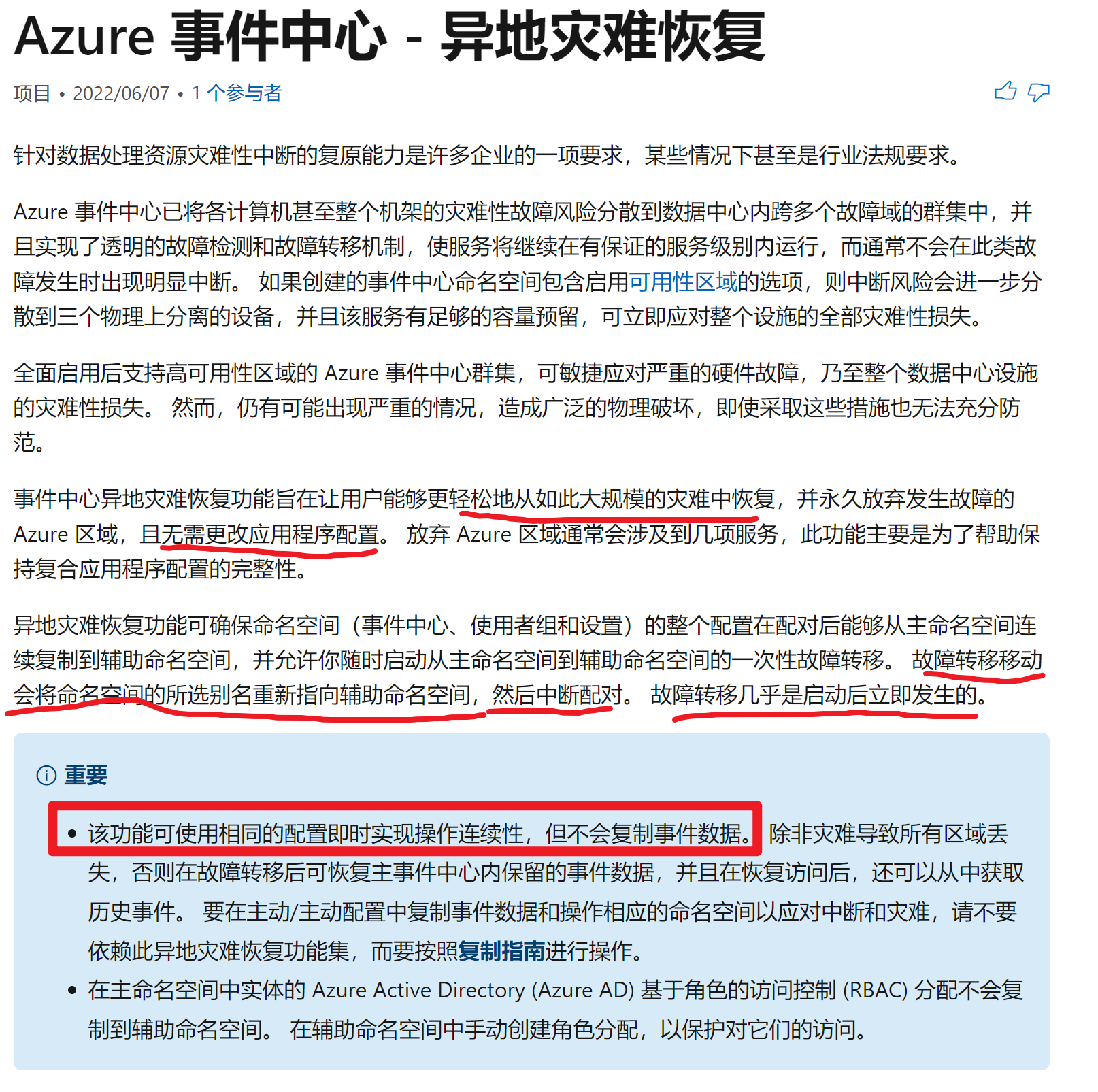 现在,Event Hub主动推出了异地灾难恢复( Geo-Disaster Recovery)功能,它旨在让用户能够更轻松地从如此大规模的灾难中恢复,且无需更改应用程序配置。关键内容见下图红色区域。