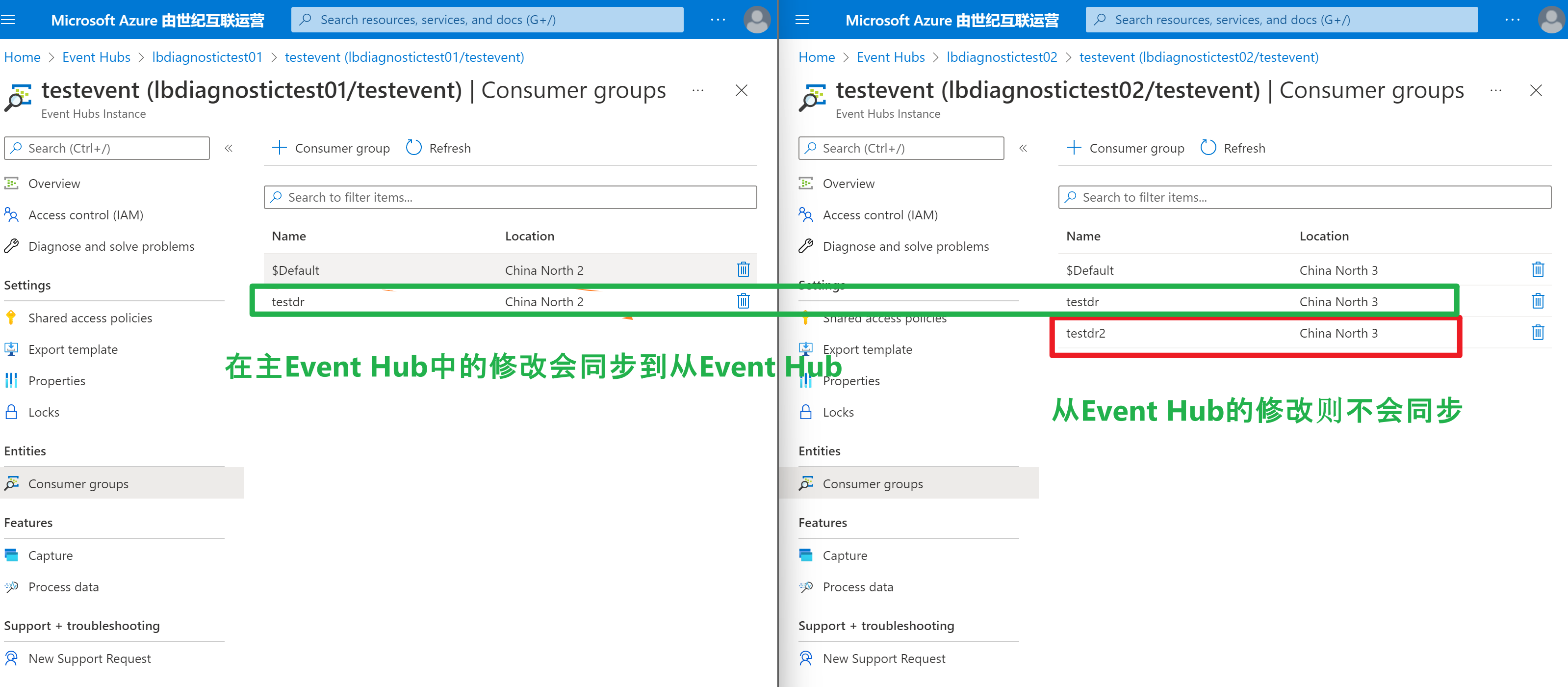第二步:在主Event Hub中添加新的消费组,同步查看次Event Hub中,验证是否已经同步配置信息。同时反向验证,先修改次Event Hub,查看主Event Hub是否同步信息