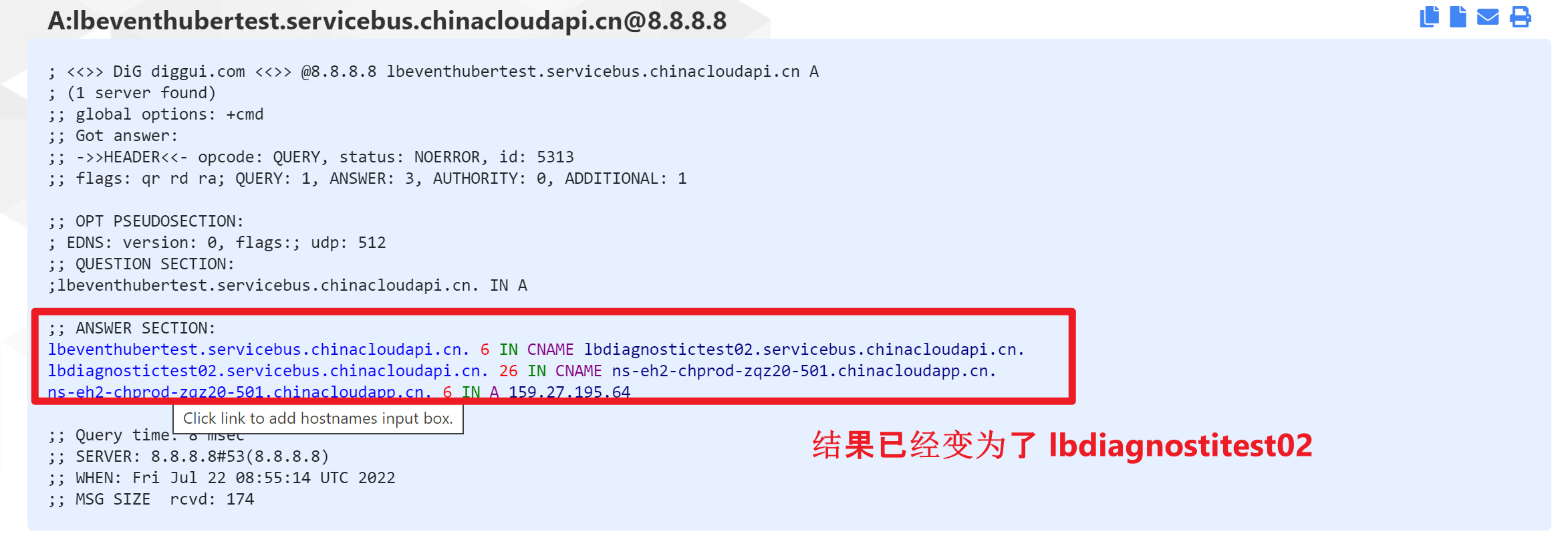 在执行前,可以通过在线Dig工具,查看当前的Alias域名(lbeventhubertest.servicebus.chinacloudapi.cn)解析出来的Host指向的为 lbdiagnostictest01