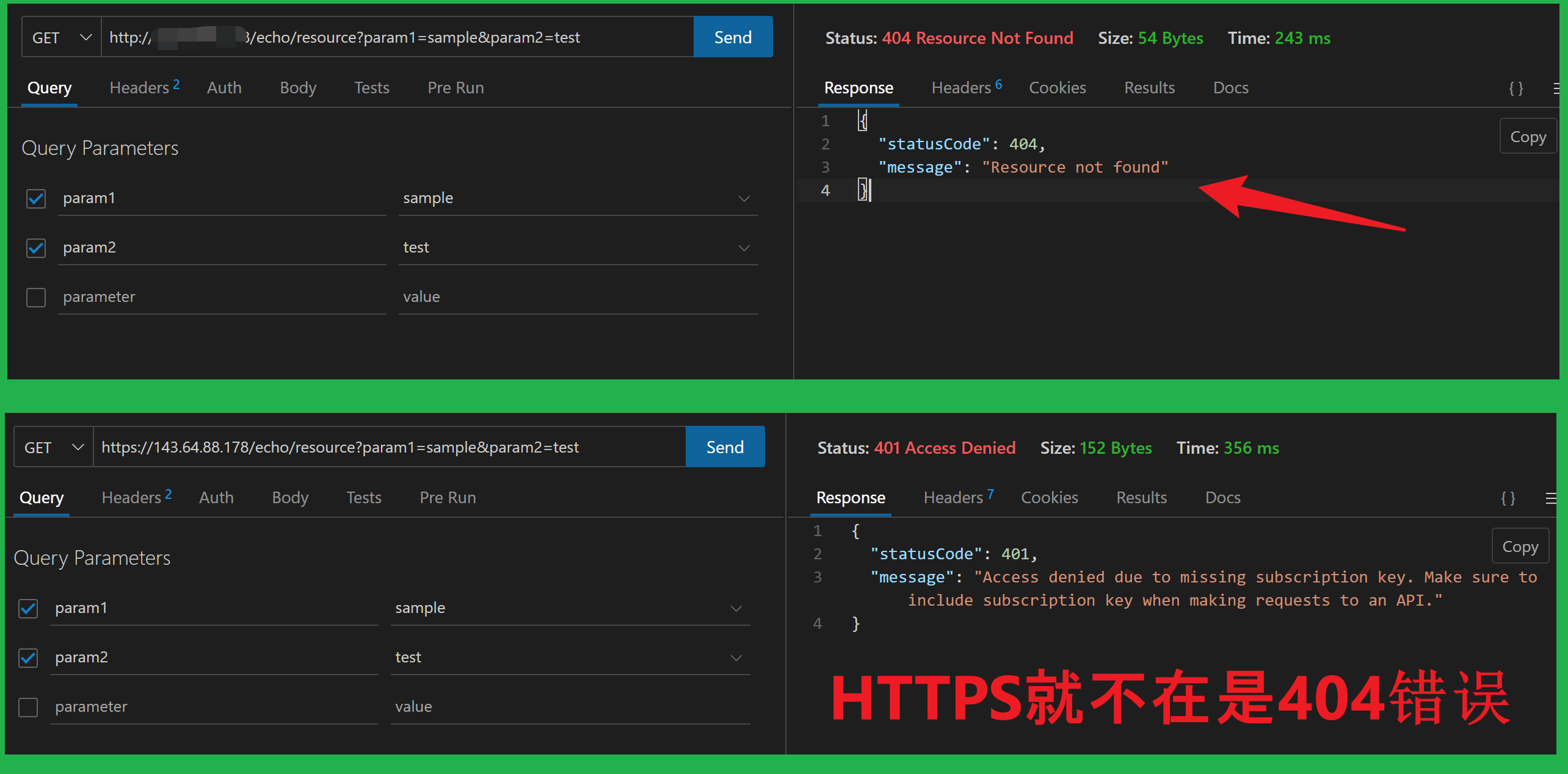 再次访问API接口:http://xxx.xxx.xxx.xxx/echo/resource?param1=sample¶m2=test, 依旧是404,就需要查看是否是API的设定中是否允许HTTP访问,