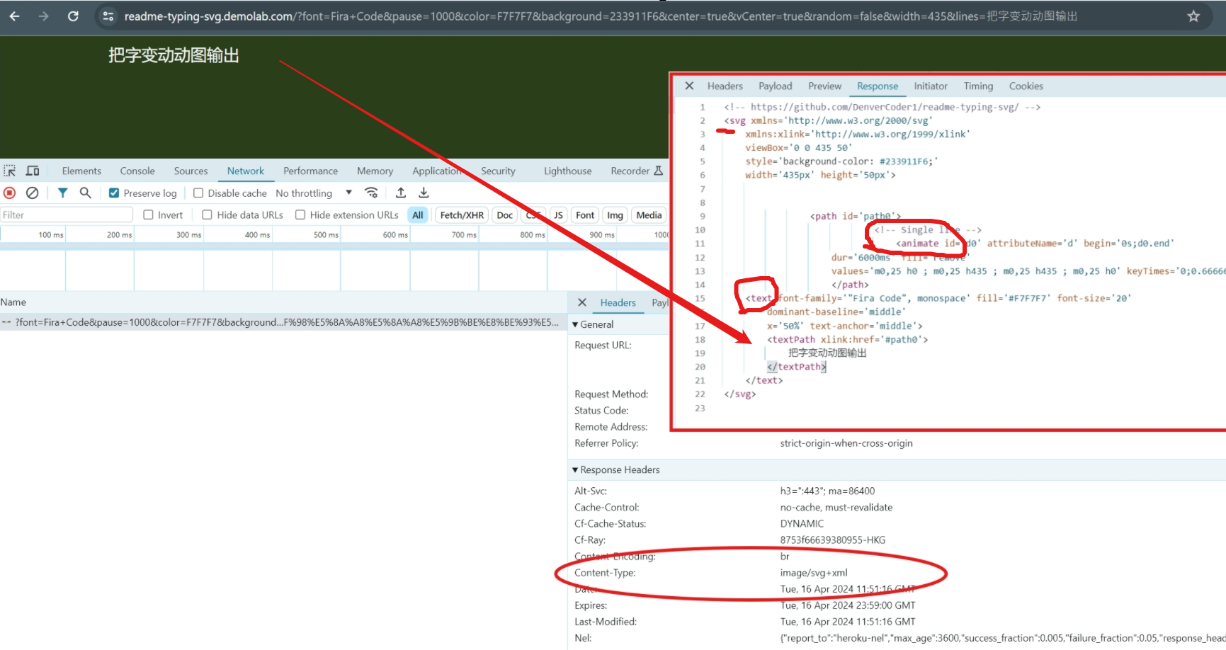 通过查看示例URL的Response Headers 和 Body Content,发现其使用的** Content-Type 为 image/svg+xml** , 内容使用svg, path, animate, text元素组合而成的HTML代码。