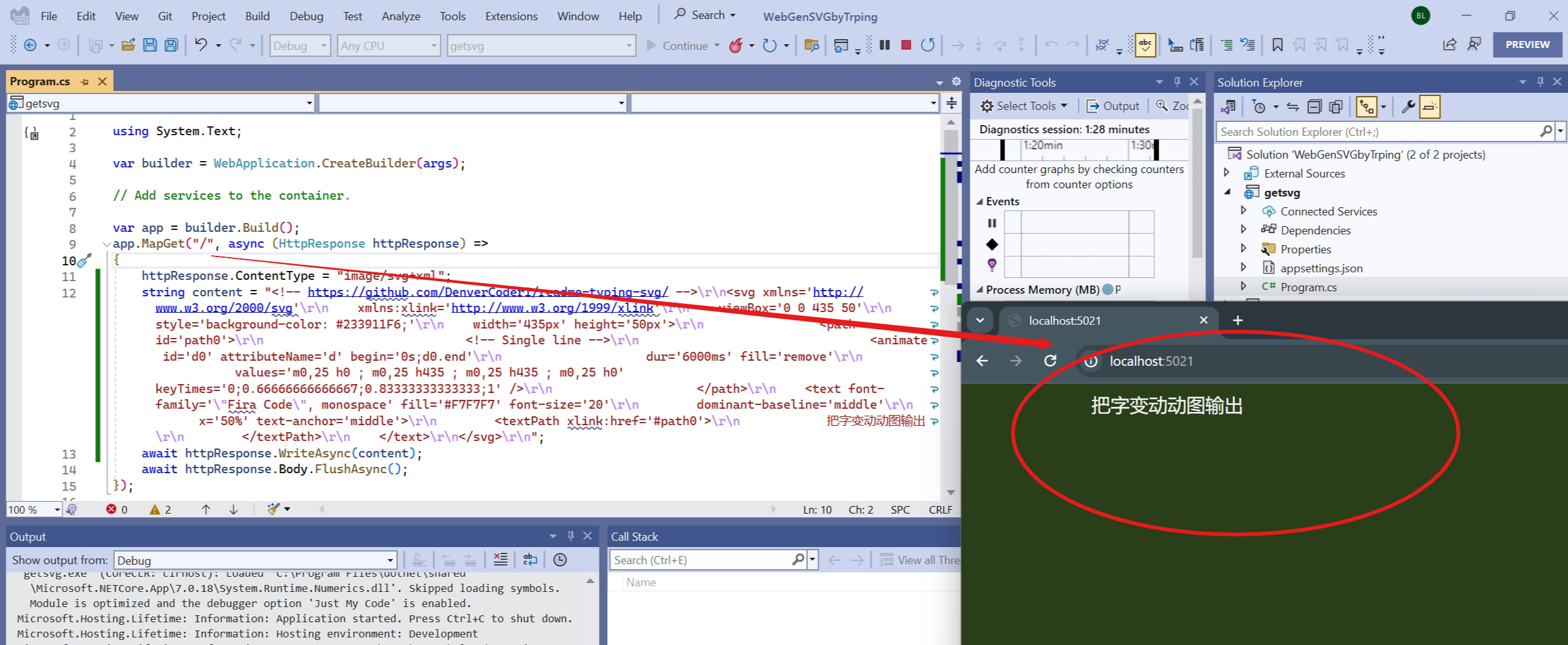 **第二步:**设置app.MapGet("/", ...),添加 httpResponse 参数并在函数体中设置 httpResponse.ContentType = "image/svg+xml"