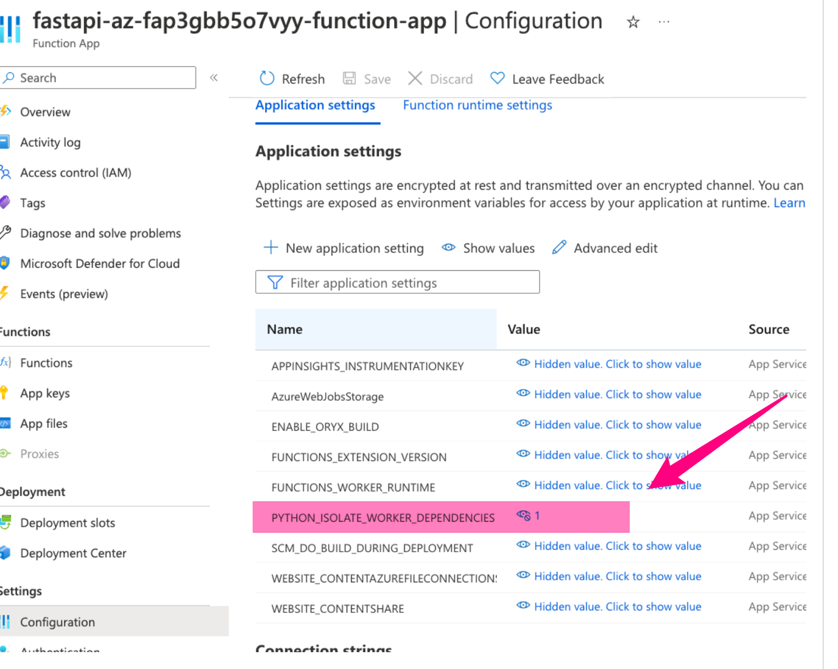 **可以参考下图,在Azure Function App的门户中,设置 PYTHON_ISOLATE_WORKER_DEPENDENCIES **