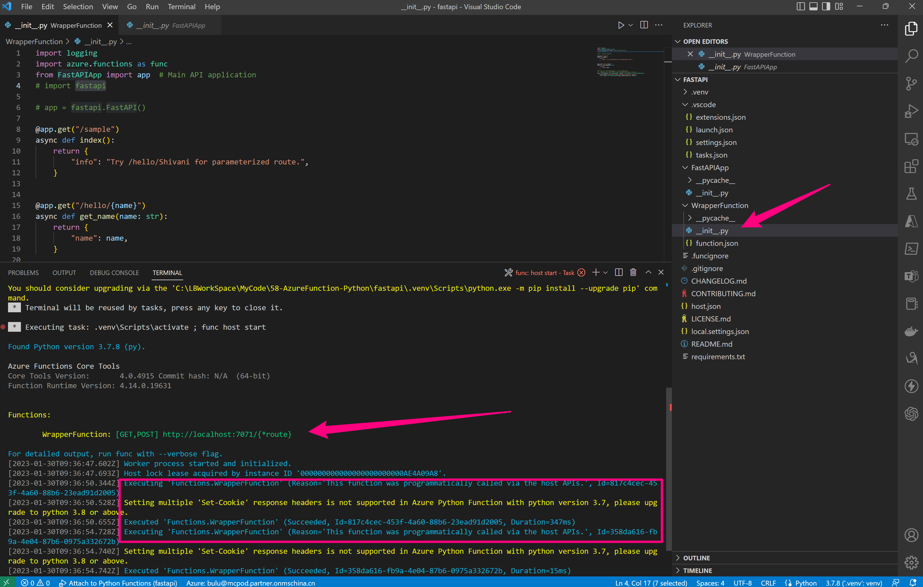 参考文档“Using FastAPI Framework with Azure Functions”, 使用FastAPI 模块在Function中实现API请求。通过VS Code本地运行成功。