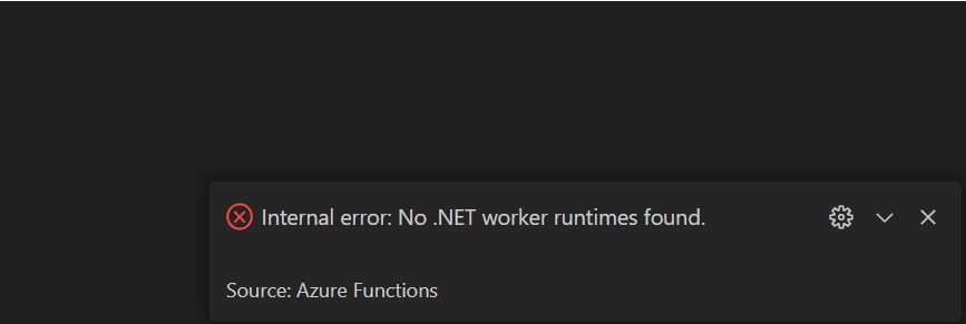 Internal error: No .NET worker runtimes foundwhen creating C# functions project #3662 : https://github.com/microsoft/vscode-azurefunctions/issues/3662alexweininger commented on May 13, 2023