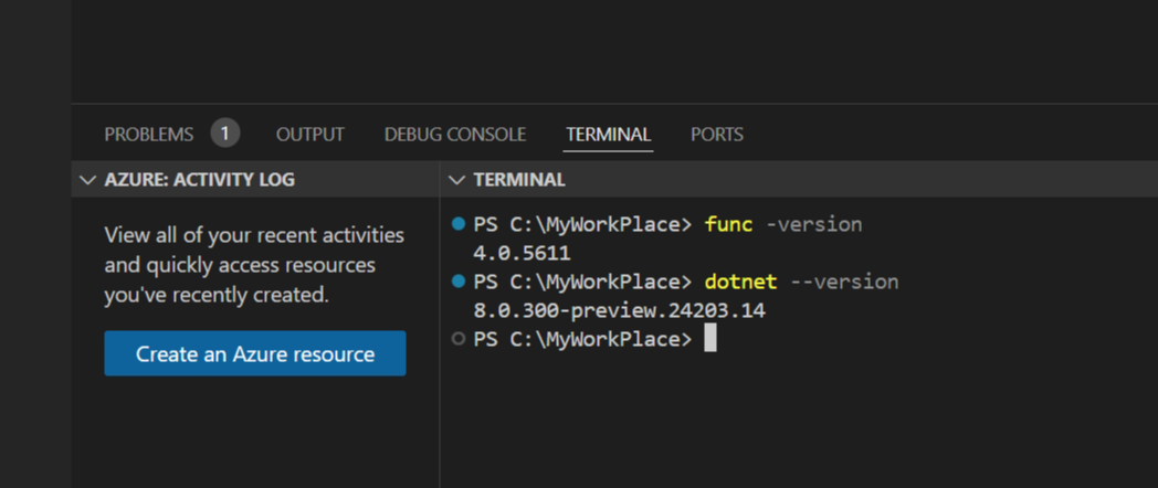 最开始看见这个错误,还真的以为是自己的 Function runtime 没有安装,于是在 VS Code 的Terminal窗口执行 func -version, 和 dotnet --version, 都能得到正确返回信息。