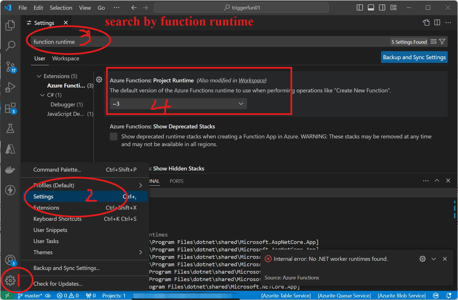 他提到在VS Code的设置中,如果把Function Runtime设置为 ~3, 而我们安装的Function Runtime 为 4.0,就会出现(Internal error:No .NET worker runtimes found)这样的错误。