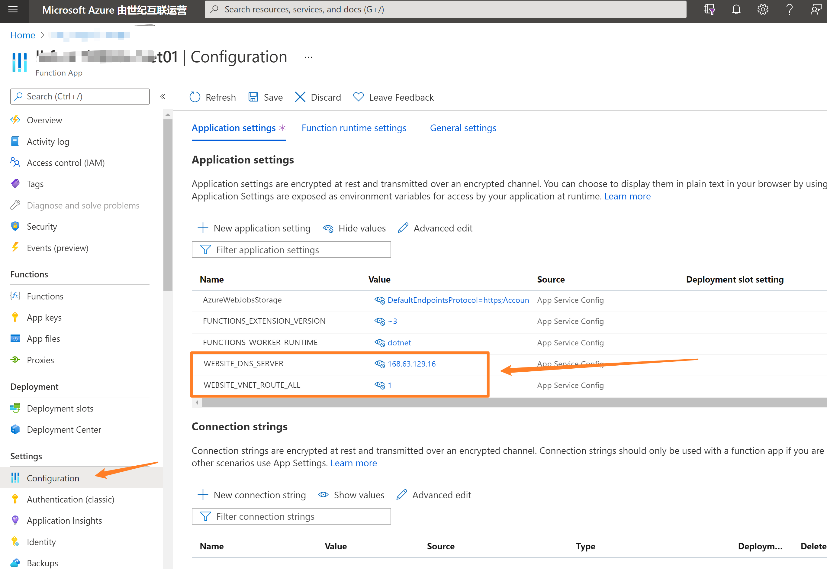 WEBSITE_DNS_SERVER:默认值为168.63.129.16。用与虚拟网络集成时,它将使用与虚拟网络相同的 DNS 服务器。 函数应用需要此设置才能与 Azure DNS 专用区域配合使用。 此设置和 WEBSITE_VNET_ROUTE_ALL 会将应用中的所有出站调用发送到虚拟网络。