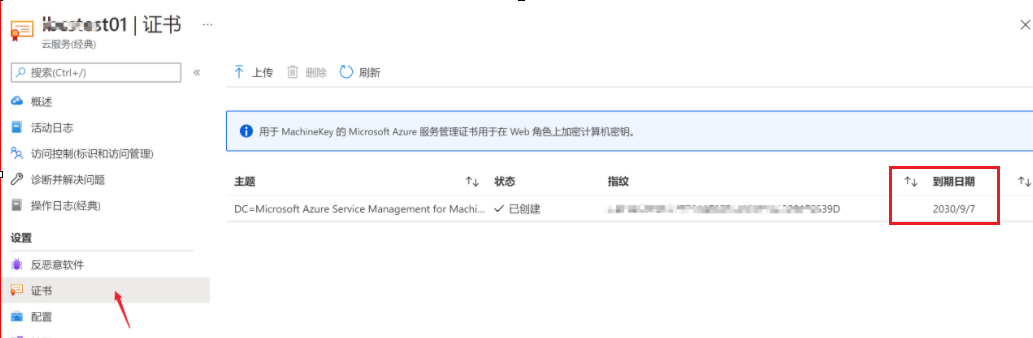 证书的过期可以有多种方式查看,最简单的方式是通过Azure云服务的门户,在“证书”一页中查看。