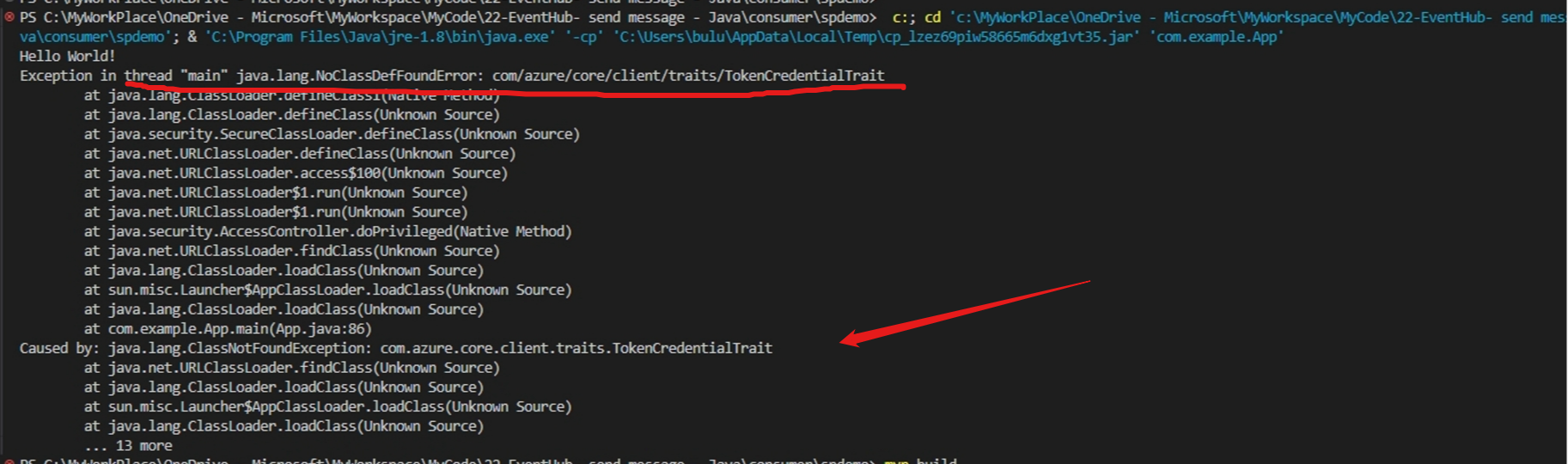 Exception in thread "main" java.lang.NoClassDefFoundError: com/azure/core/client/traits/TokenCredentialTrait