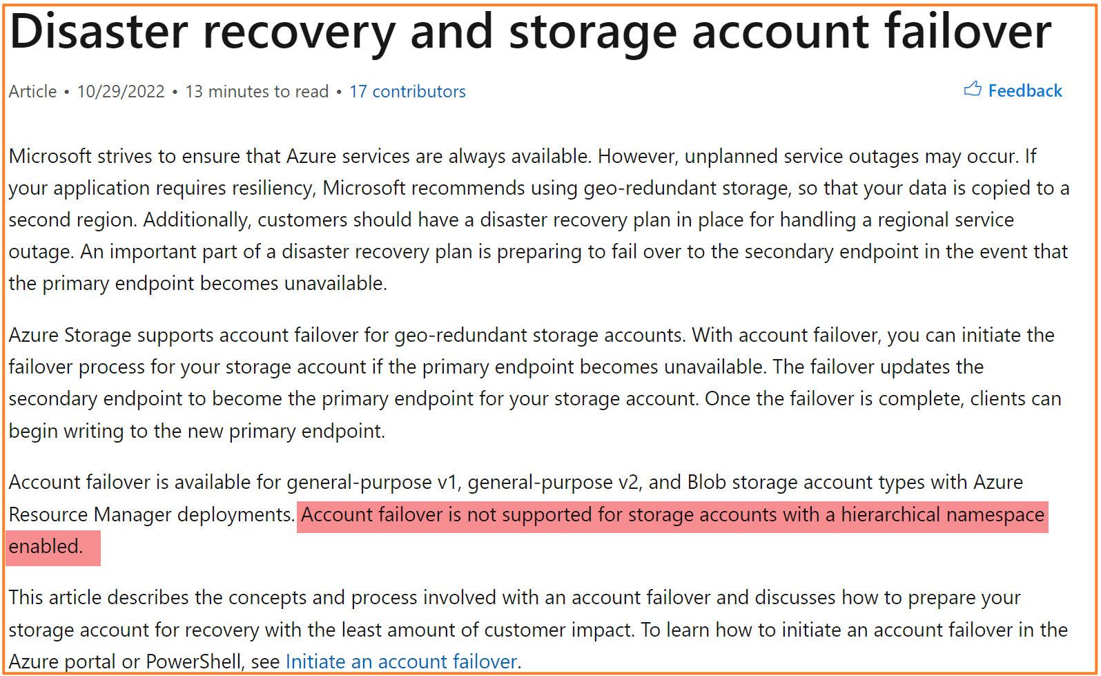 在Azure的存储服务中,介绍灾备恢复和Storage Account故障转移的文档中,有一句话“Account failover is not supported for storage accounts with a hierarchical namespace enabled.” 而 Hierarchical namespace(分层命名空间)所指恰好是 ADLS Gen 2, 那么是否说明ADLS不支持Failover呢?如果Azure不能自动Failover,是否支持手动触发Failover呢?