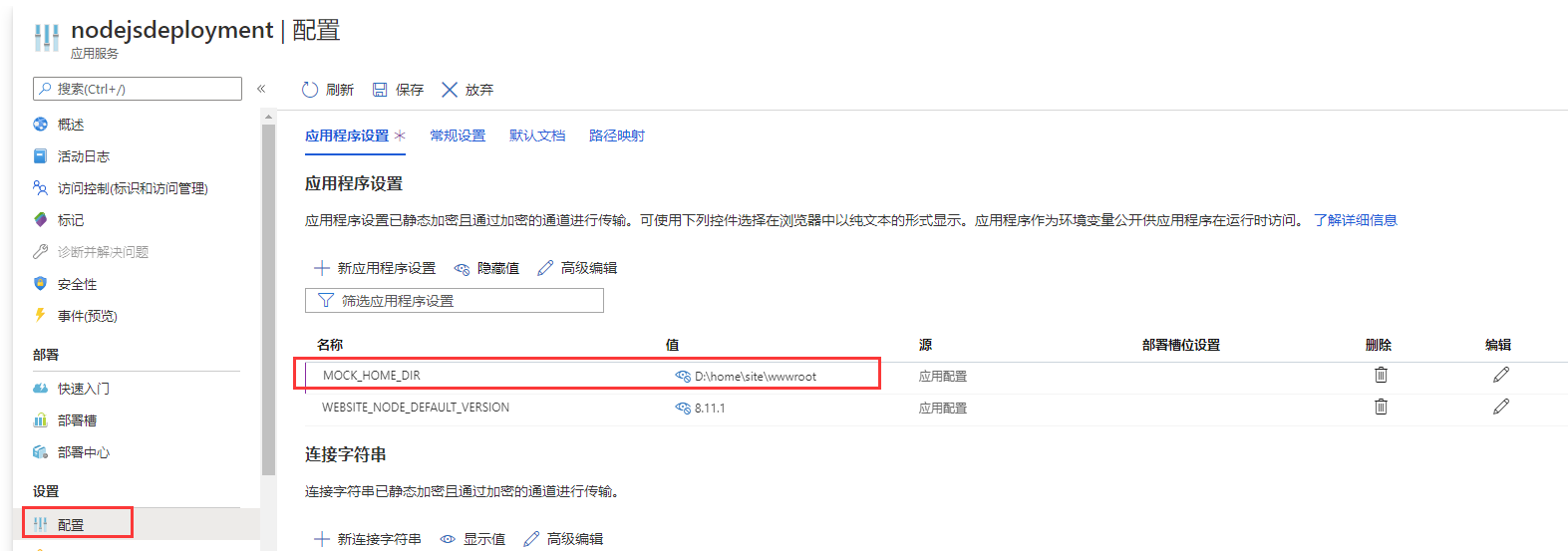 - 最快速且无代码改动方案。在App Service的应用程序设置中(Applicaiton Settings)添加一个名MOCK_HOME_DIR的设置,并设置其值为D:\home\site\wwwroot\ (为应用程序发布的默认路径)。 这样node-homedir的源代码就不会进入到os部分。直接在第一行就返回需要的homedir.
