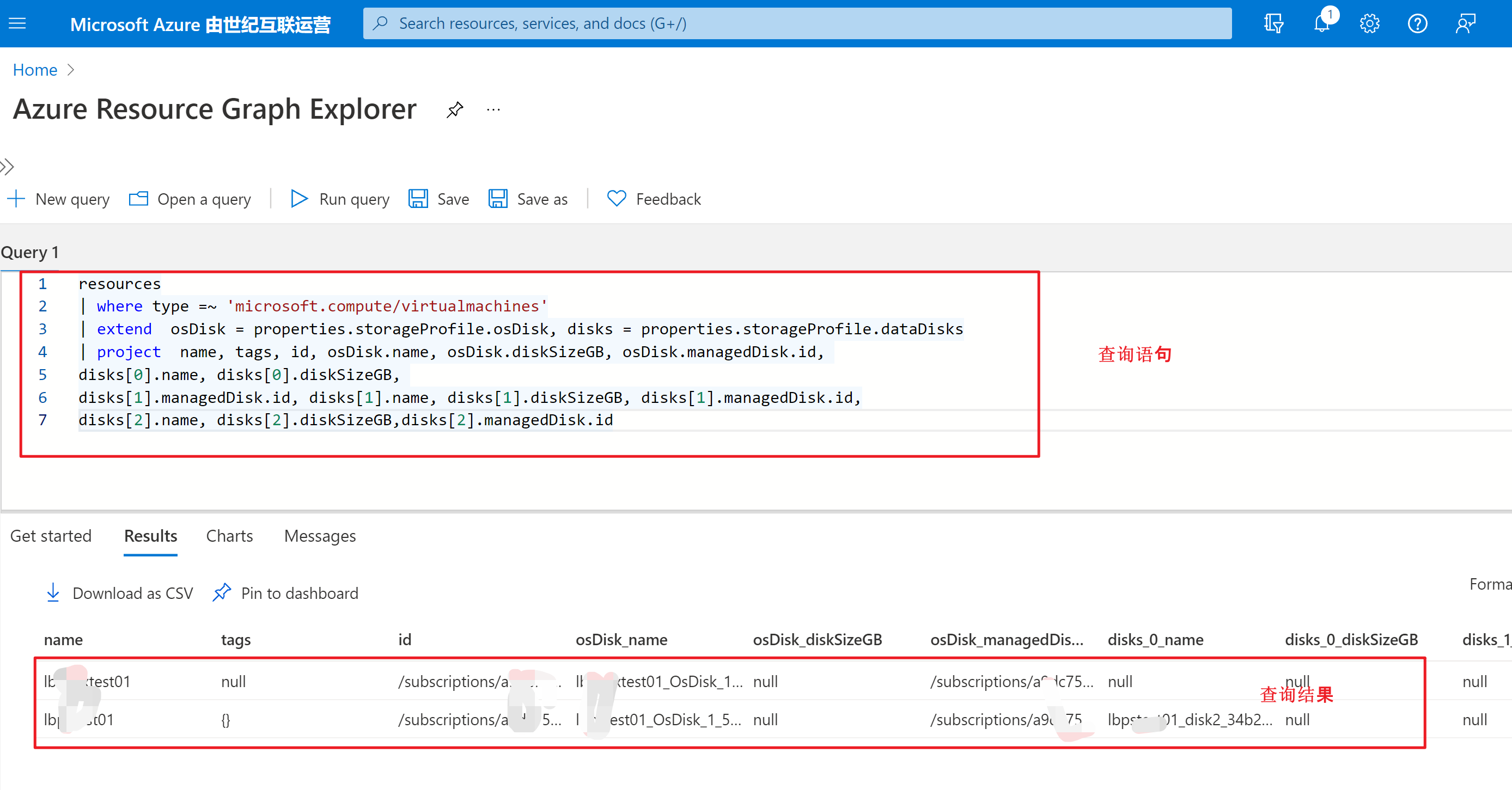 使用Azure Resource Graph查询:把这订阅(Subscription ID)下的VM虚拟机和相关磁盘信息拉取一下数据(VM名字,VM的tag,VM的资源ID,硬盘名字,硬盘大小,磁盘的资源ID)