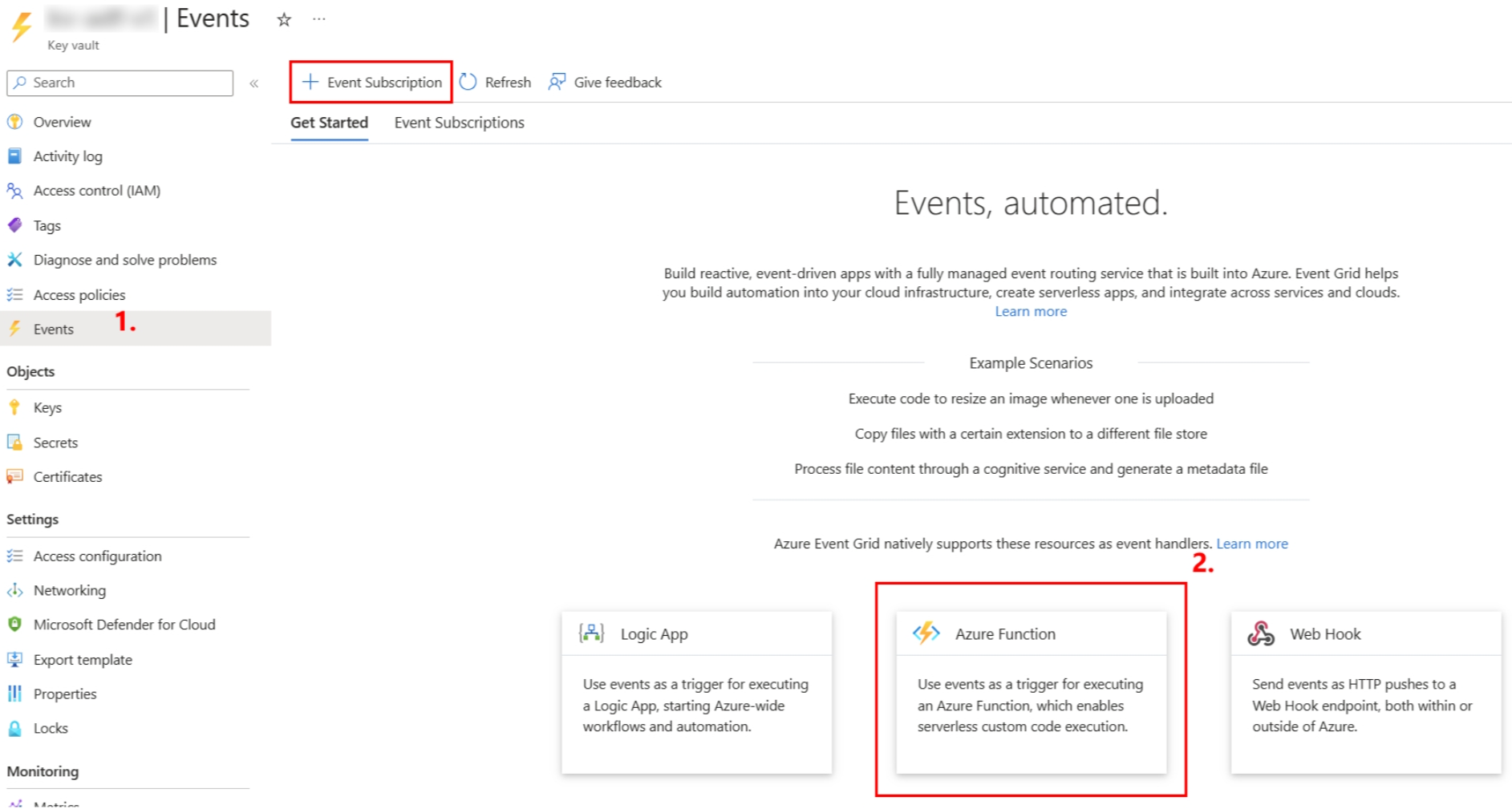 在KeyVault中可以直接设置Event,增加事件订阅 (比如:Microsoft.KeyVault.KeyNearExpiry, Microsoft.KeyVault.KeyExpired),并可以直接由事件触发事件处理程序
