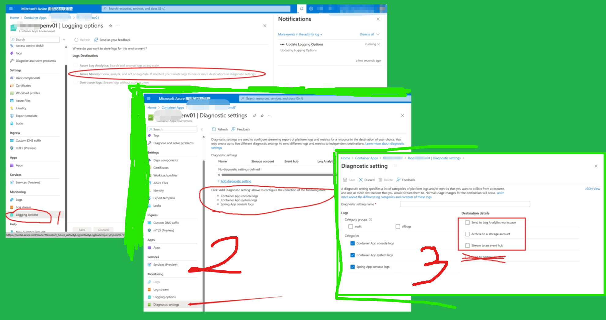 把应用部署到Azure Container Apps(容器应用),可以在Container App Environemnt级别设置诊断日志,把日志收集到Event Hub / Log Analystic Workspace / Storage Account中。