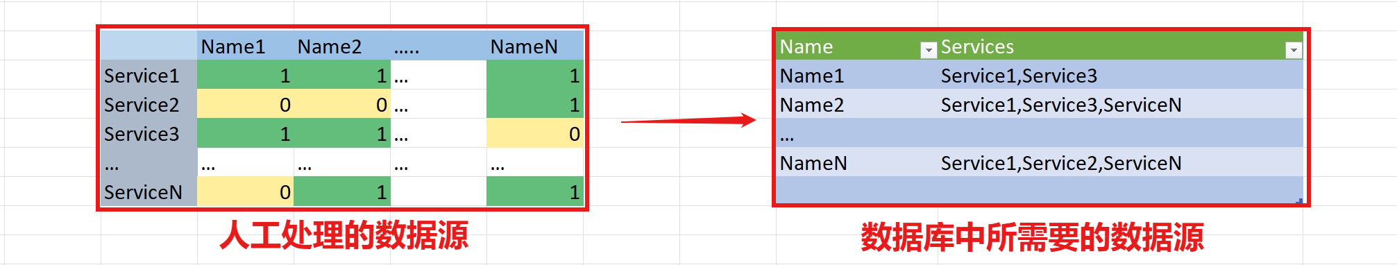 **第一种情况:**服务名作为第一列内容,然后之后每一列为一个人名,1:代表此人拥有这个服务,0:代表不拥有。