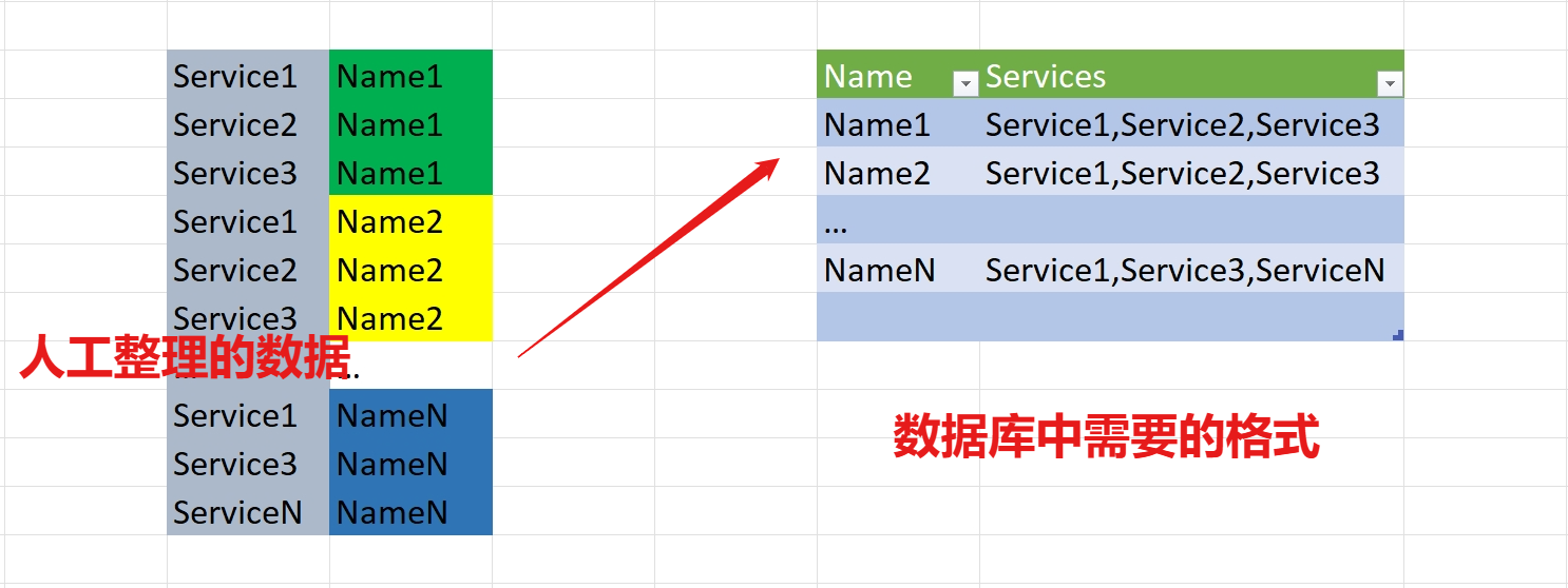 **第二种情况:**服务名称为第一列,第二列紧跟人名,并均有重复的情况。