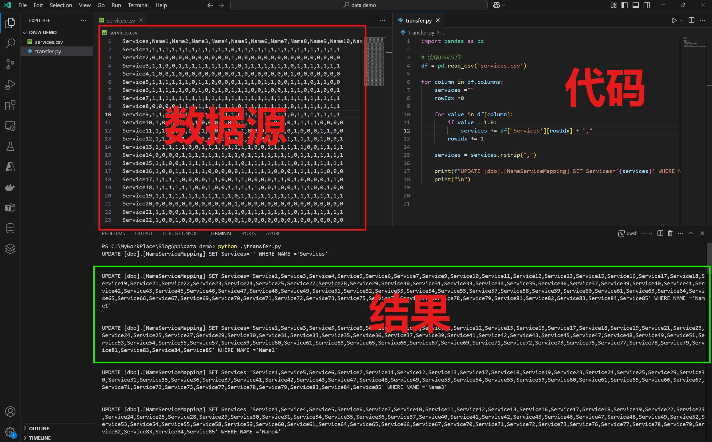print(f"UPDATE [dbo].[NameServiceMapping] SET Services='{d[key]}' WHERE NAME ='{key}'")