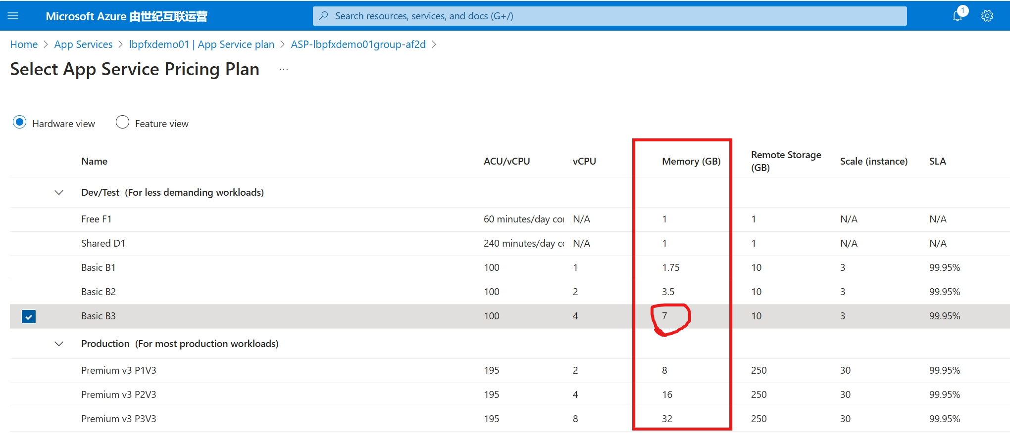 在创建App Service服务的时候,根据定价层不同,内存使用的最大值也有不同。但在实际测试中,发现内存最大只能占用2GB左右,