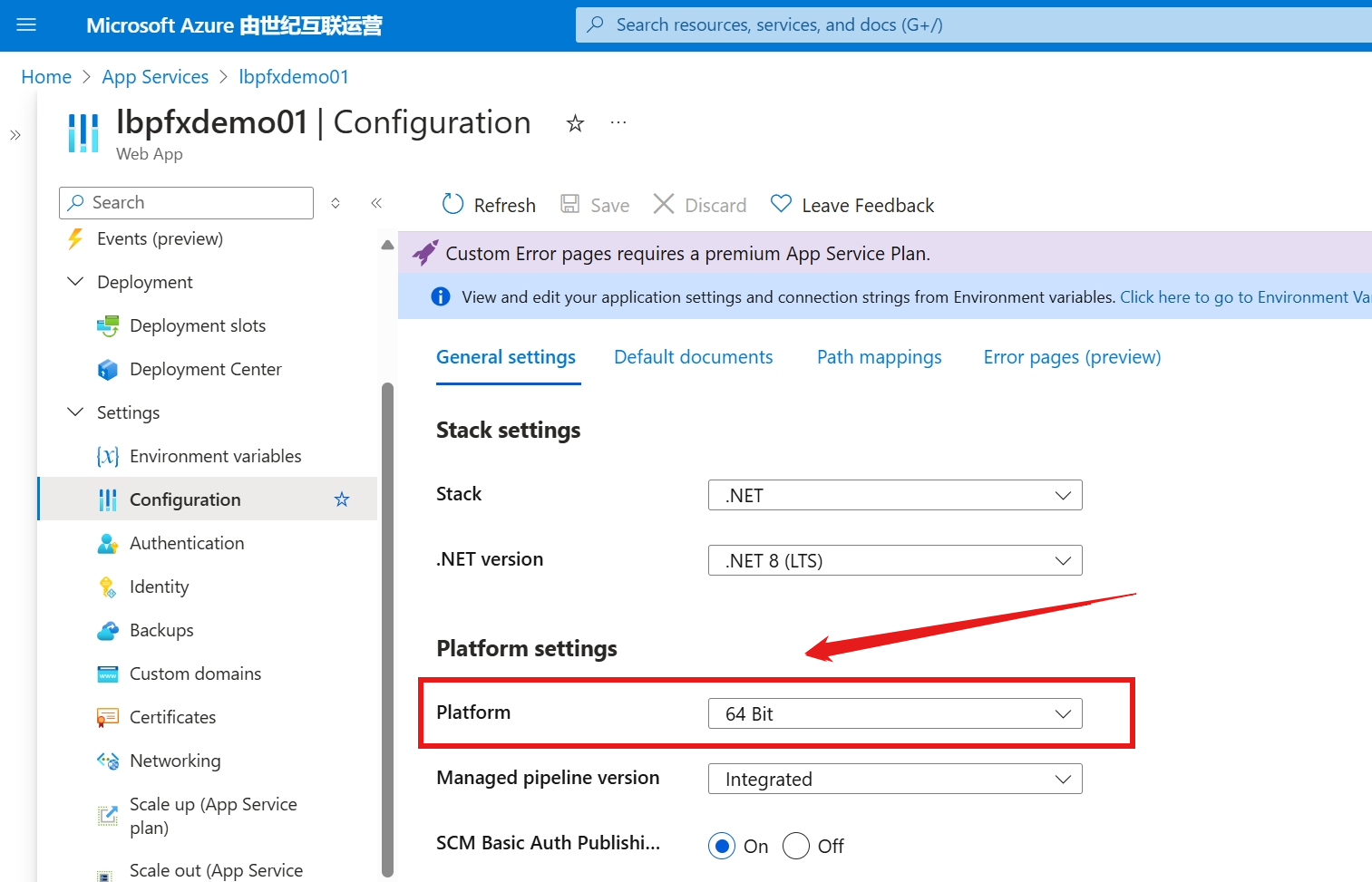 根据以上测验,当使用App Service内存没有达到预期的值,且应用异常日志出现OutOfMemory时,就需要检查Platform的设置是否位64bit。