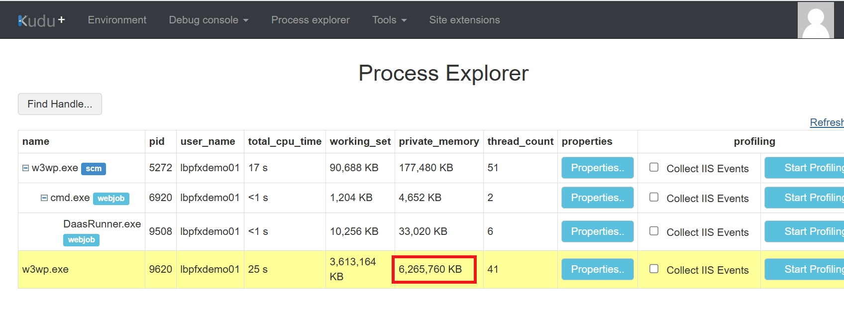 在App Service中Kudu工具上,查看进程分配的内存大小: