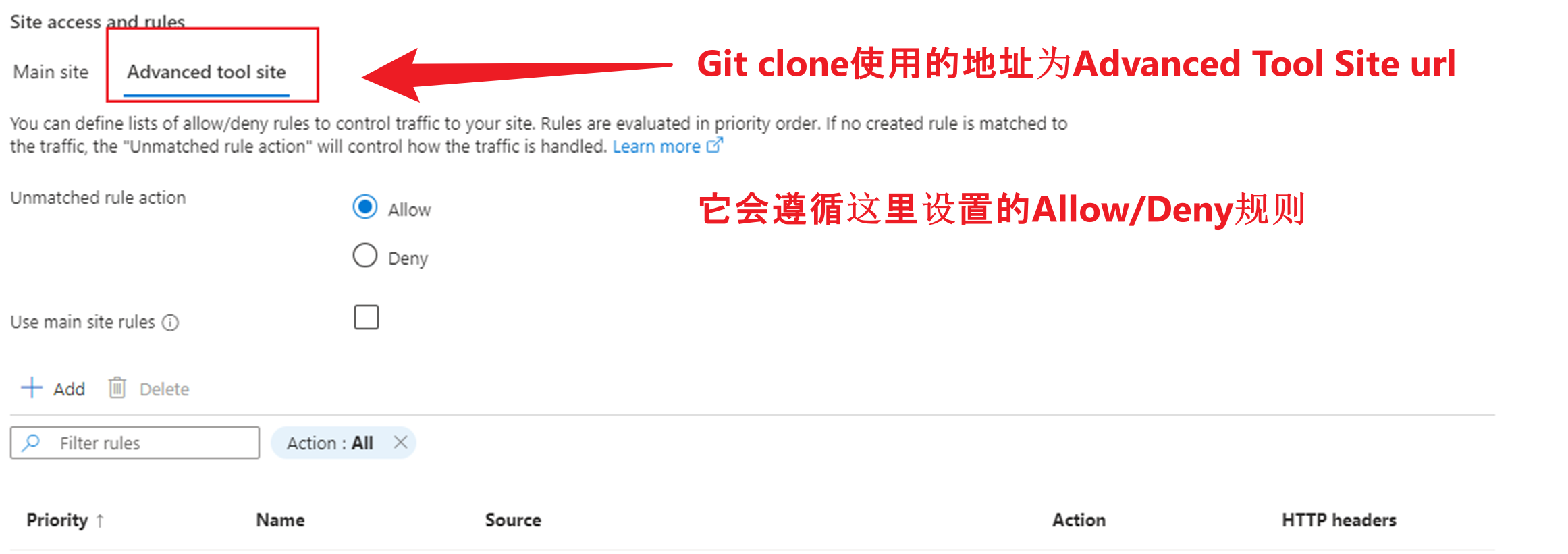因为在使用 git clone App Service的应用代码时,使用的URL地址为 https://.scm.chinacloudsites.cn/.git,它是通过公网访问,并且会根据设定的访问限制来放行或者是拒绝。