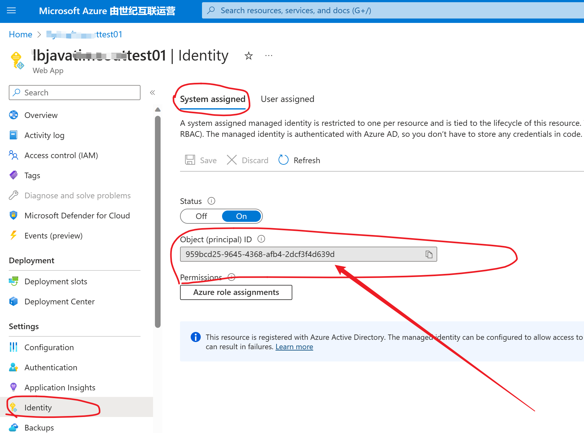 在App Service中启用Identity后,使用系统自动生成 Identity。