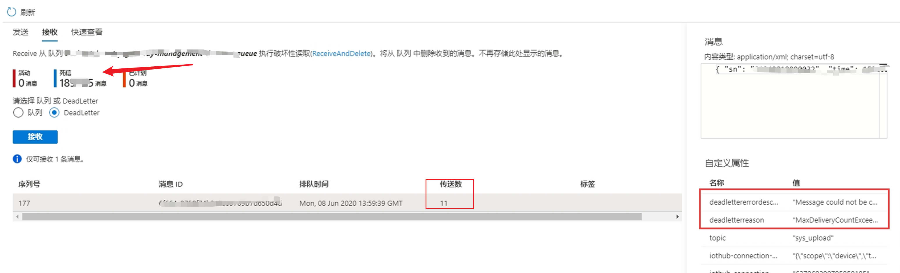 当前,我们也可以从Azure门户中查看到当前DLQ的数量,所占空间及进入DLQ的原因