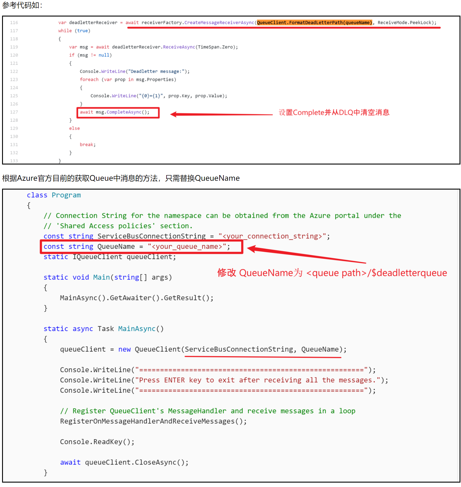 如需要通过程序的方式获取死信队列中的消息,获取消息的方式和正常队列一样,把queueName变为死信队列的路径,通过**QueueClient.FormatDeadLetterPath(queueName)**方式获取