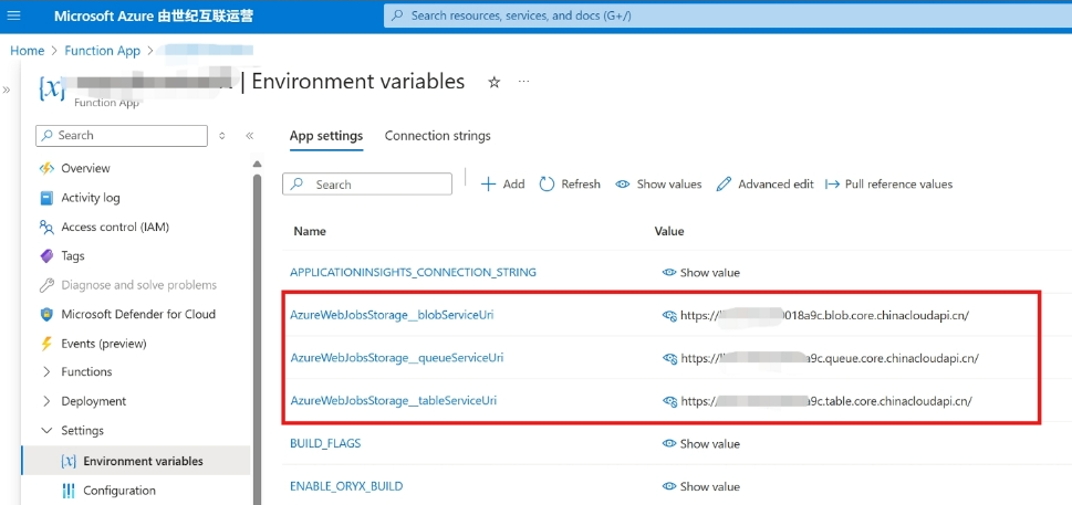 AzureWebJobsStorage__tableServiceUri,值为 https://<your-storage-account-name>.table.core.chinacloudapi.cn/