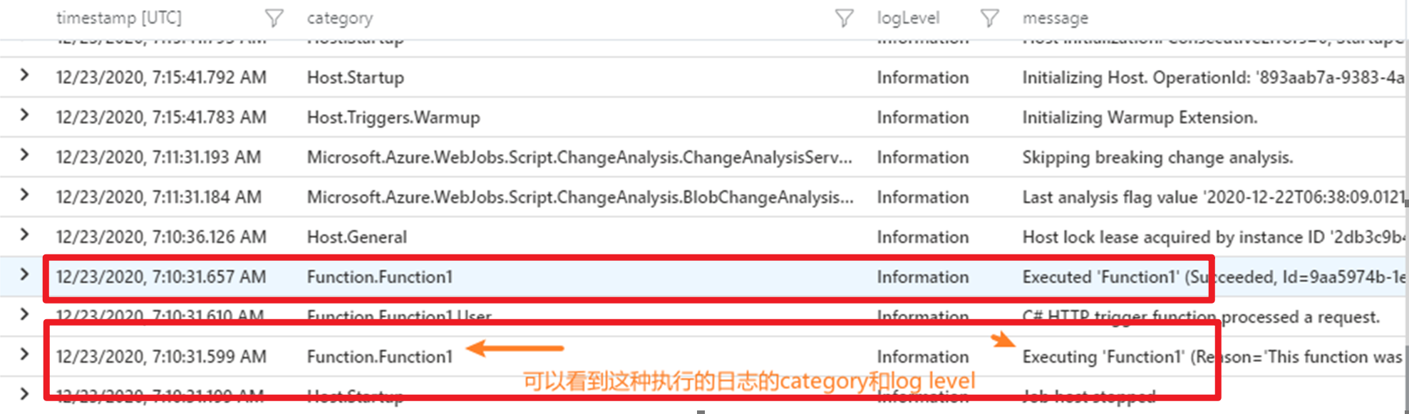 所以根据以上的基础信息,在Application Insights的Trace表中,我们查看到函数执行日志的Category和LogLevel,这样就可以针对性的设置收集日志的参数。