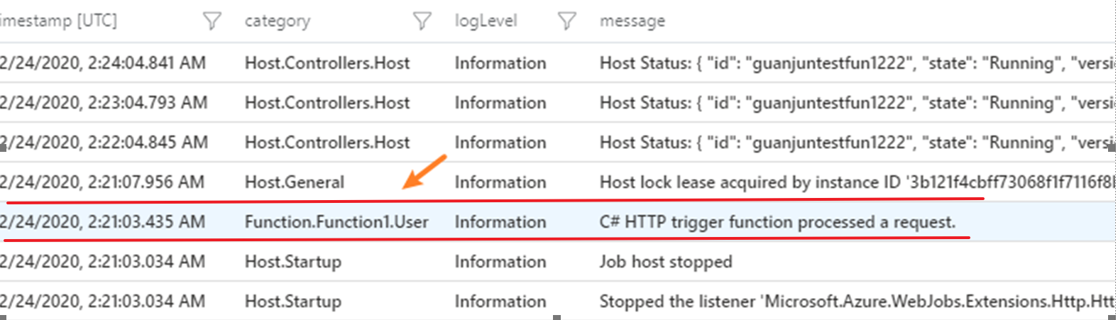 基于.NET Core的Function App如果配置了Application Insights之后,每有一个函数被执行,则在Application Insights中的Logs中的trace里都可以查询到函数的执行启动,执行结束的信息。类似如下的日志,