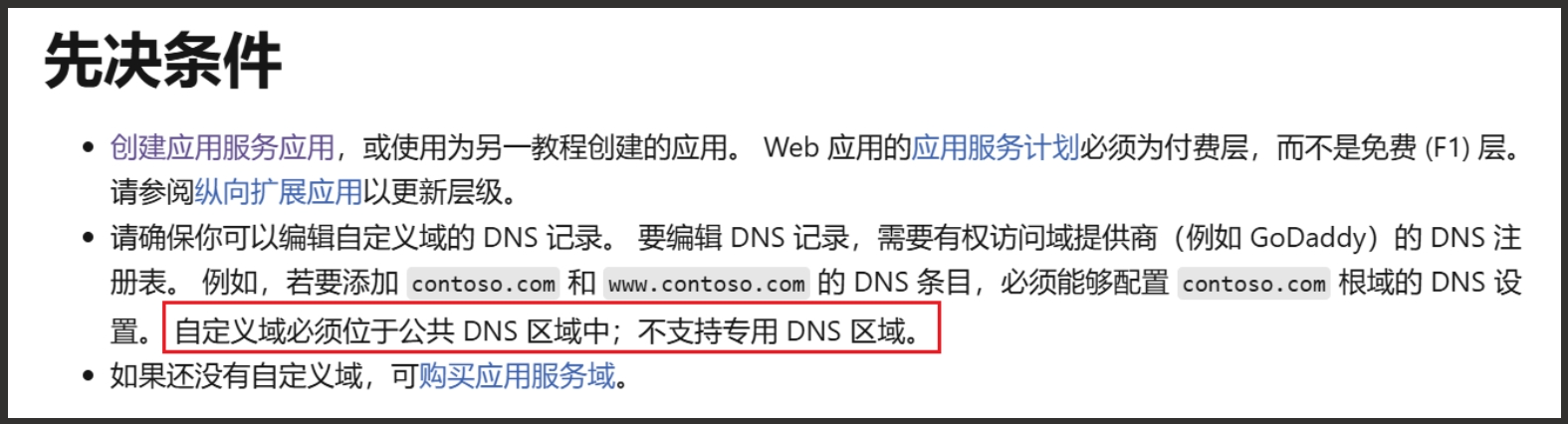 App Service 不支持私网域名,自定义域名必须位于公共DNS服务器上,关于自定义域名详细请参考:映射现有的自定义 DNS 名称 - Azure App Service | Microsoft Learn
