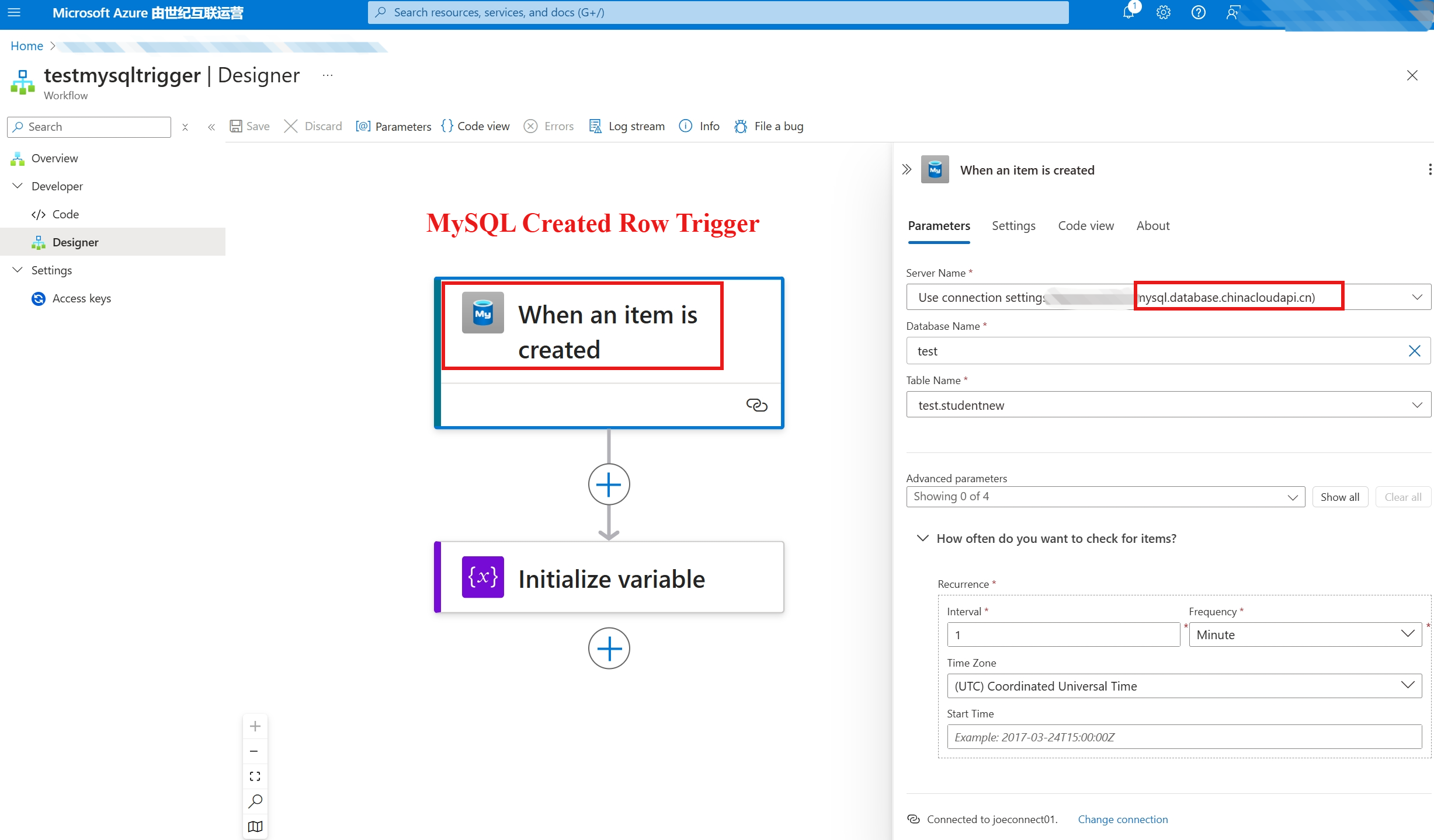 使用Azure Logic App服务,用于监控MySQL数据库的数据新增后,触发后续的逻辑处理操作。