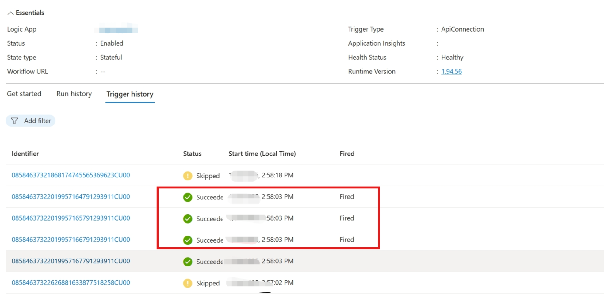 * PS: 图中的Skipped状态表示触发器定时每分钟从MySQL表中获取新增的数据。如果没有新增数据,则标记为Skipped。*