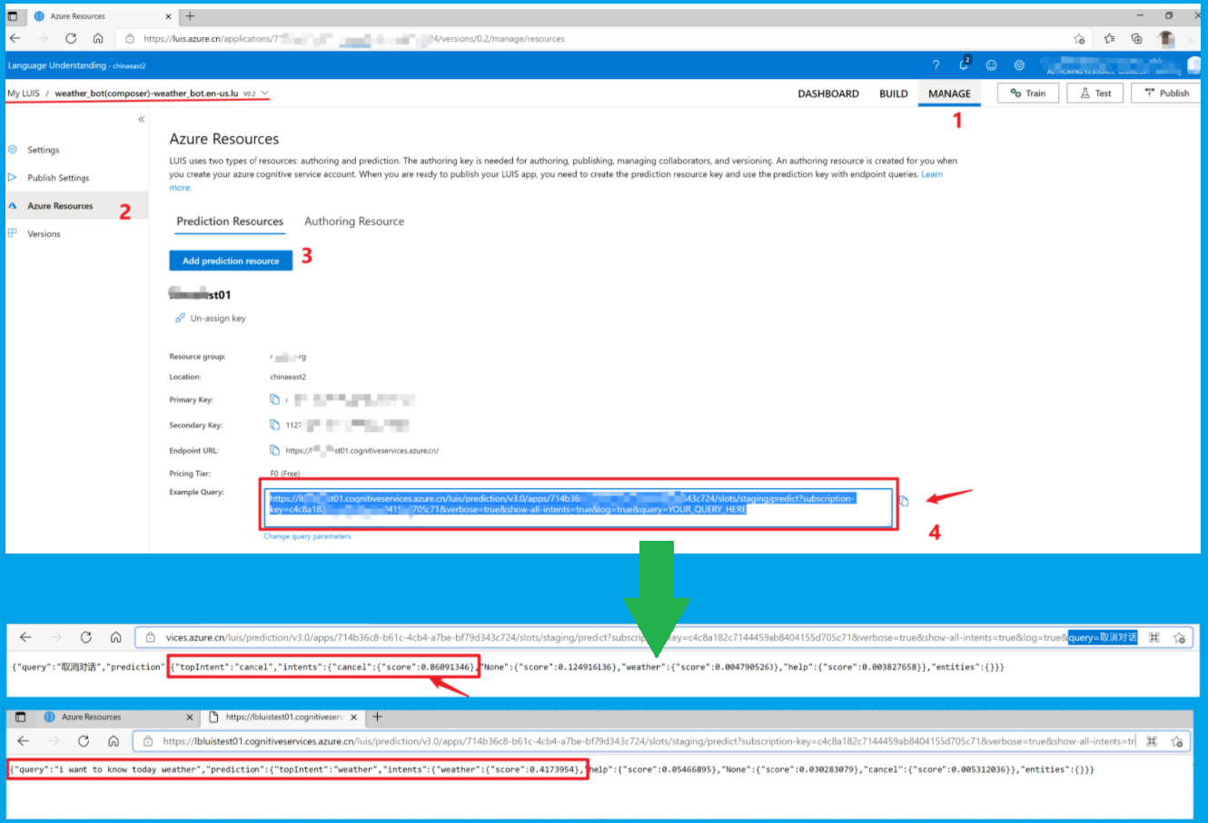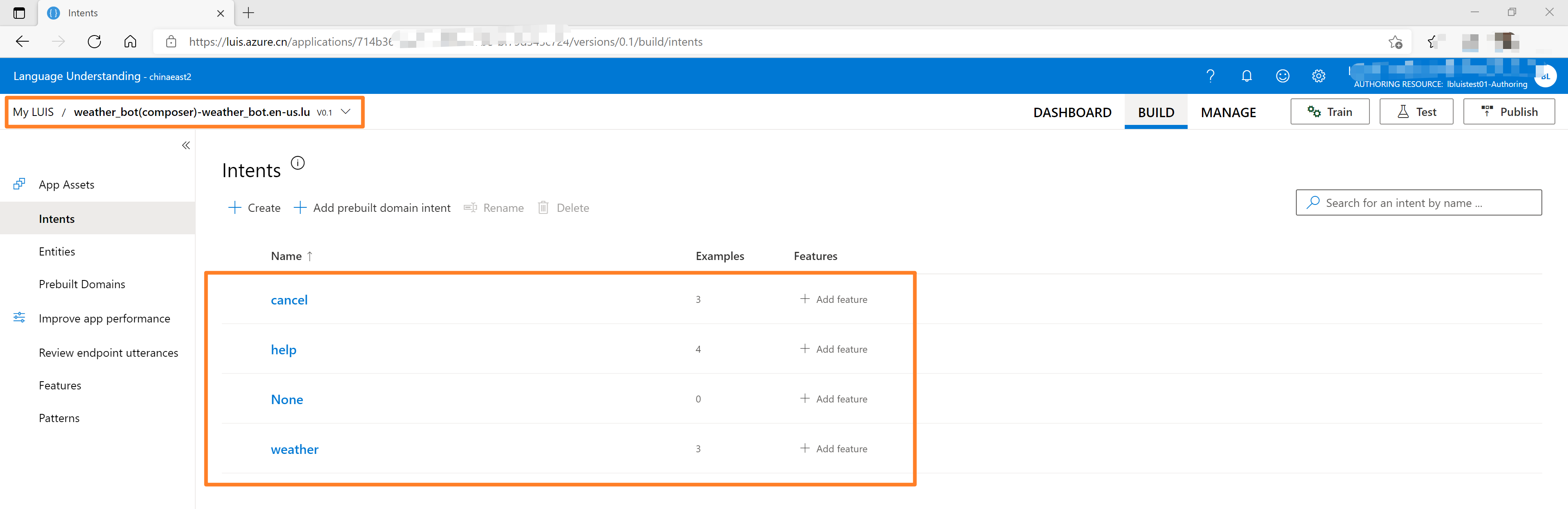 第四步(非常重要的验证步骤):登录LUIS门户(https://luis.azure.cn/applications), 验证并测试weather_bot的LUIS App是否创建成功?语意和实体等是否同步过来?项目是否发布?验证调用结果(LUIS门户 --> LUIS APP -->MANAGE --> Azure Resources -> )。如果在测试遇见 403 Forbidden -- "This application cannot be accessed with the current subscription." 最大的原因是在LUIS门户中新建的weather_bot 没有Publish。