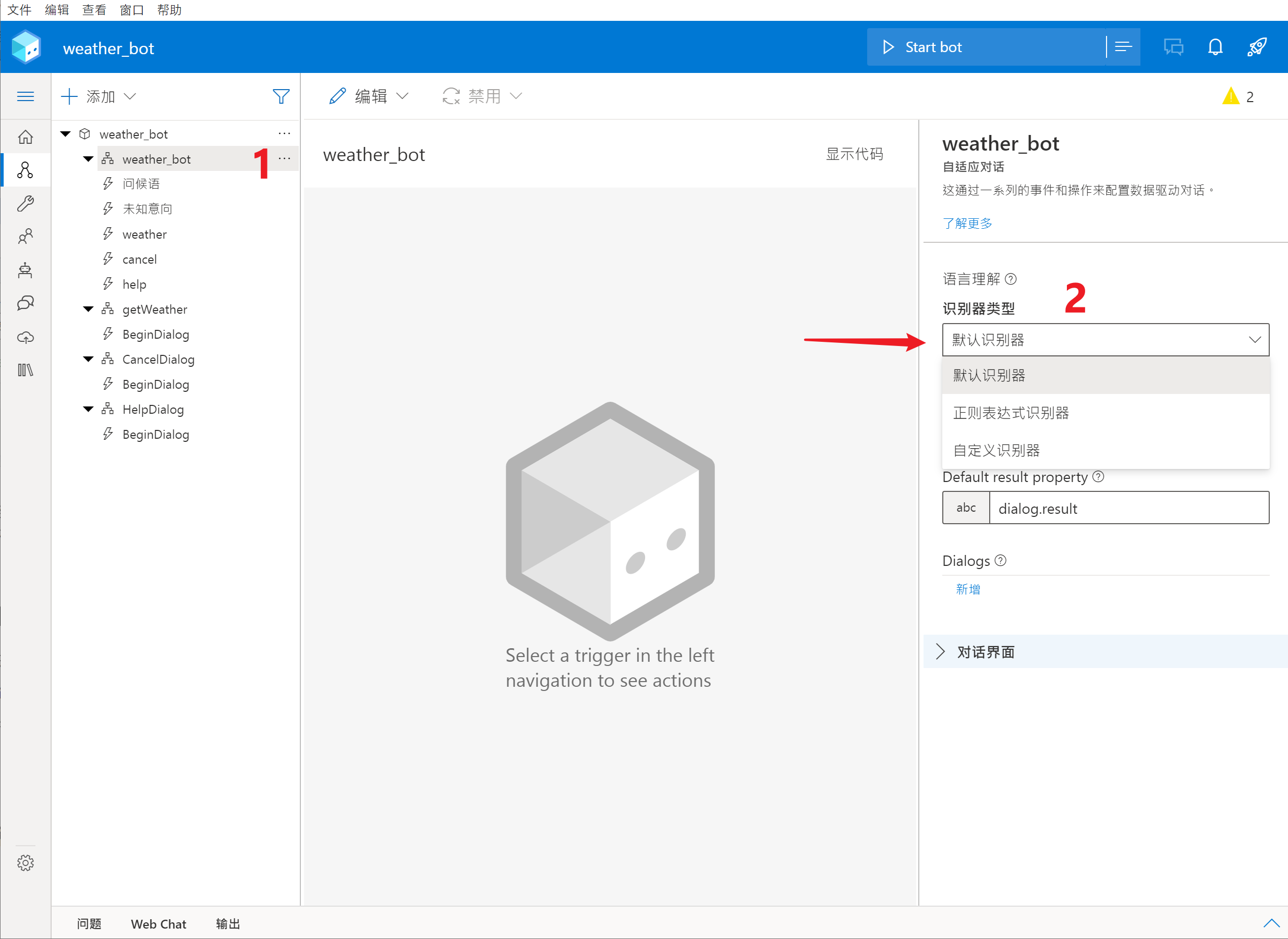 第三步:在右侧的属性栏中,从“ 识别器类型 ”中选择“ 默认识别器 ”。默认识别器即使用LUIS