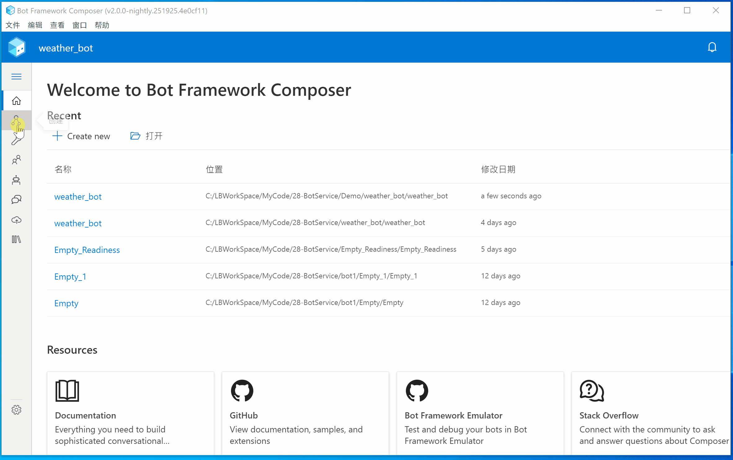 第二步:在左侧导航栏中选中weather_bot对话组件