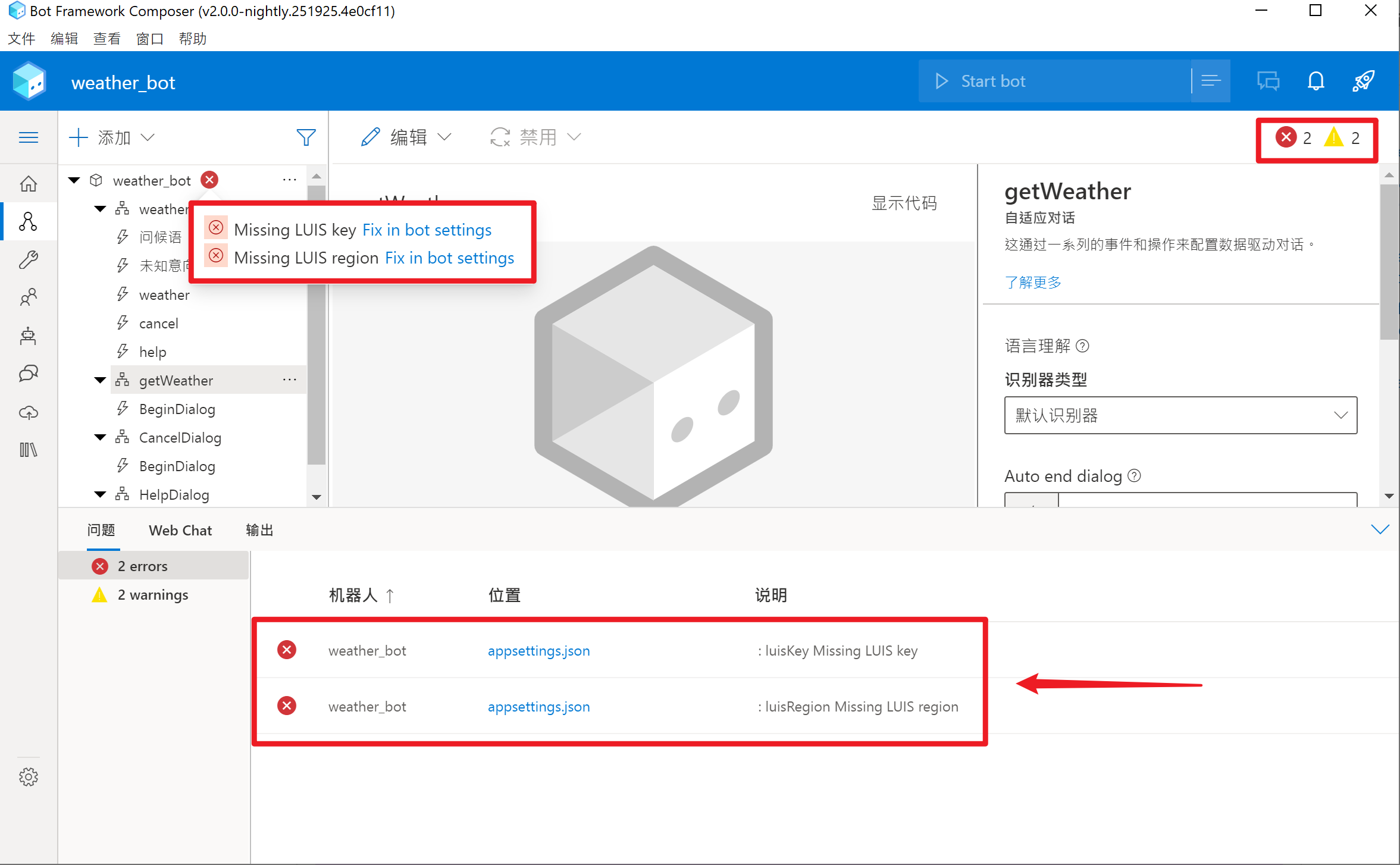 正如上一节中配置了LUIS语意和条件后,Bot Composer会提示有两个错误(在右上角)。这正是由于当前还没有配置LUIS资源。需要在appsettings.json文件中设置LUIS key和region信息。