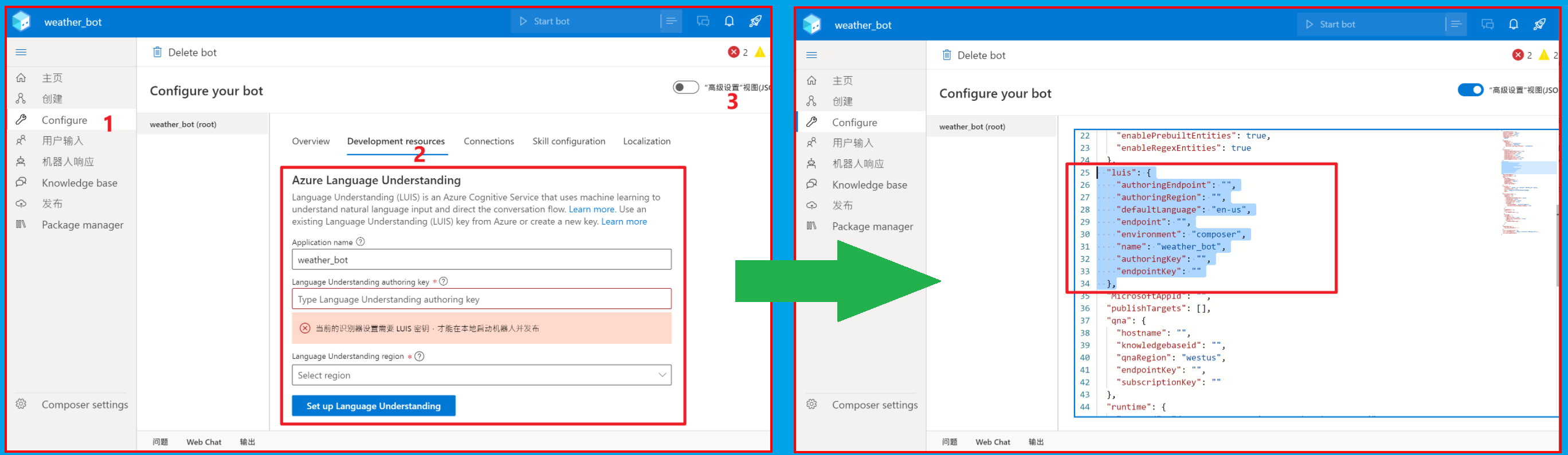第二步:回到Bot Composer界面,可以直接点击错误提示中的”appsettings.json“进入文件中为luis节点设置值:(最左侧导航中选择”Configure“,"Development resources",点击右上角的JOSN视图查看,填充第一步中的值)。