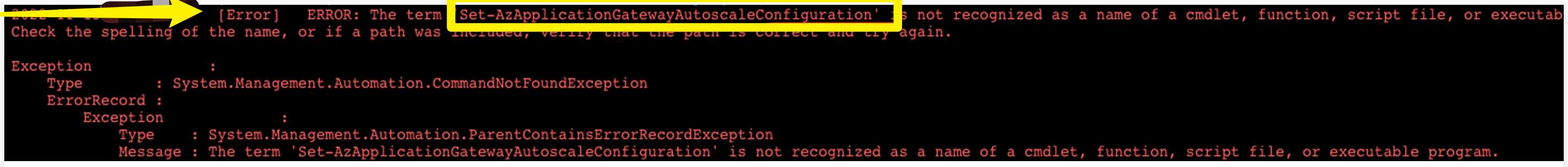2:[Error] ERROR: The term 'Set-AzApplicationGatewayAutoscaleConfiguration' is not recognized as a name of a cmdlet, function, script file, or executable program. Check the spelling of the name, or if a path was included, verify that the path is correct and try again