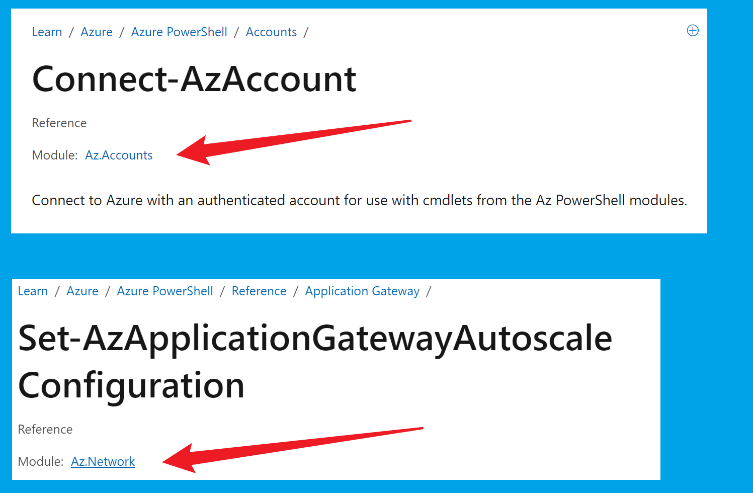 而 Connect-AzAccount 对应的module为 az.Accounts, Set-AzApplicationGatewayAutoscaleConfiguration 对应的module为 Az.Network。